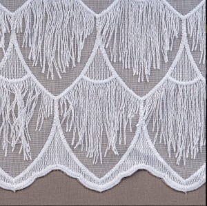 Elegancka firana markizeta w kolorze białym z aplikacją i wykończeniem frędzelkami. Wysokość 300 cm. Nowoczesna dekoracja okienna do salonu, jadalni i sypialni.