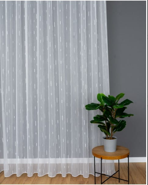 Wykonana z wysokiej jakości markizety, firana jest zwiewna, półprzezroczysta i łatwa w pielęgnacji. Struktura materiału sprawia, że firana doskonale się układa, a wzór typu „deszczyk” tworzy delikatny efekt przestrzenny. Dzięki wysokości 300 cm pasuje do większości okien i drzwi balkonowych, dając wiele możliwości aranżacji.
