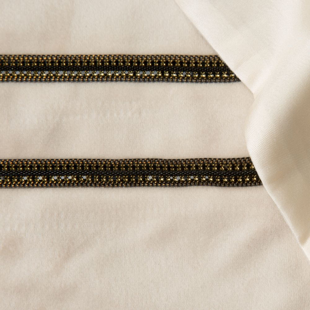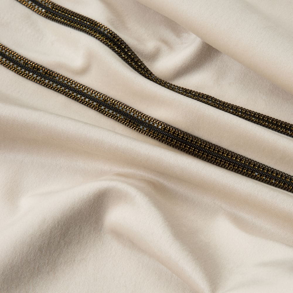 Elegancki bieżnik wykonany z miękkiej i miłej w dotyku tkaniny welwetowej, ozdobiony dwoma pasami efektownej pasmanterii z drobnymi cyrkoniami. szerokość: 35 cm, długość: 140 cm, kolor: kremowy, Gramatura: 250 GSM, Skład: 100% poliester
