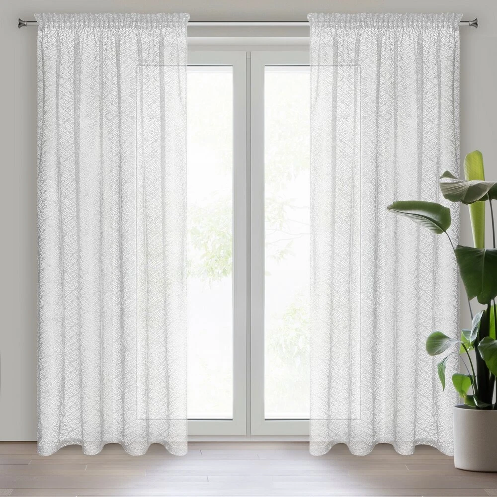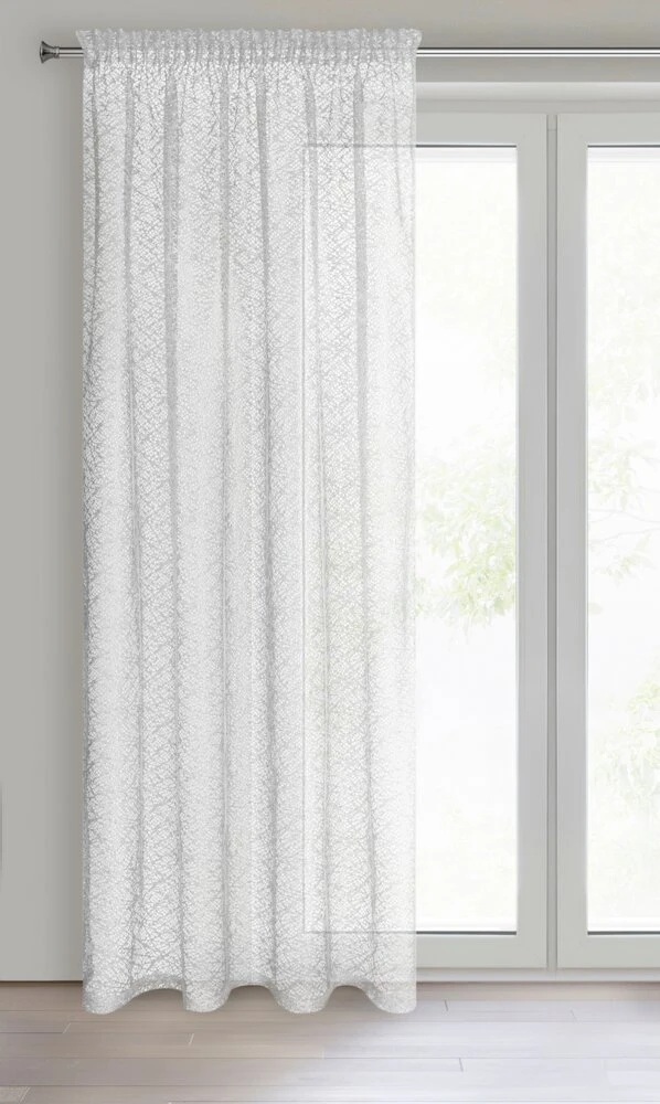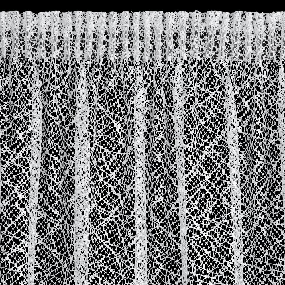 Nowoczesna firana z nieregularnej siateczki o subtelnym połysku i róznej wielkości oczek. Doskonała również w roli dekoracyjnej zasłony. Nie należy wybielać. szerokość: 140 cm, długość: 270 cm, kolor: biały, Gramatura: 120 GSM, Skład: 100% poliester