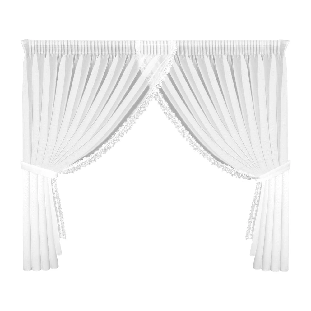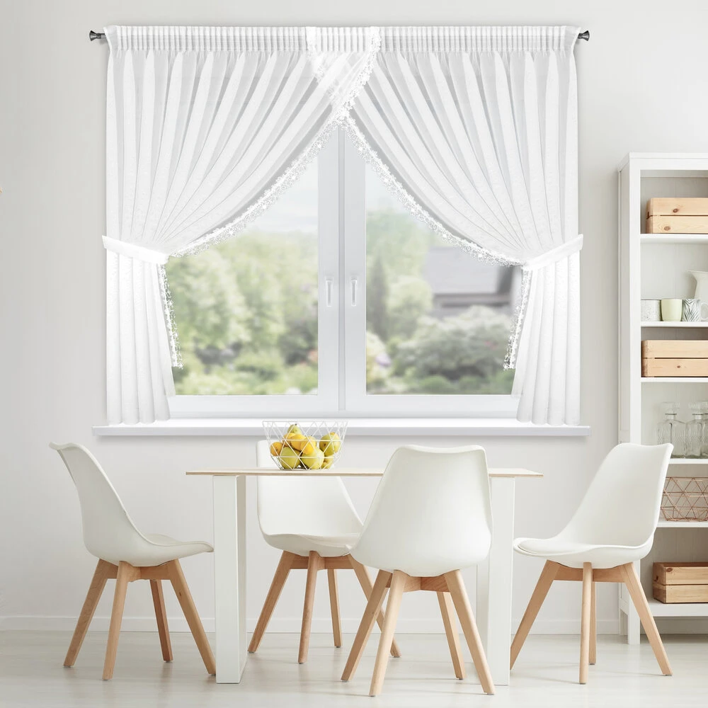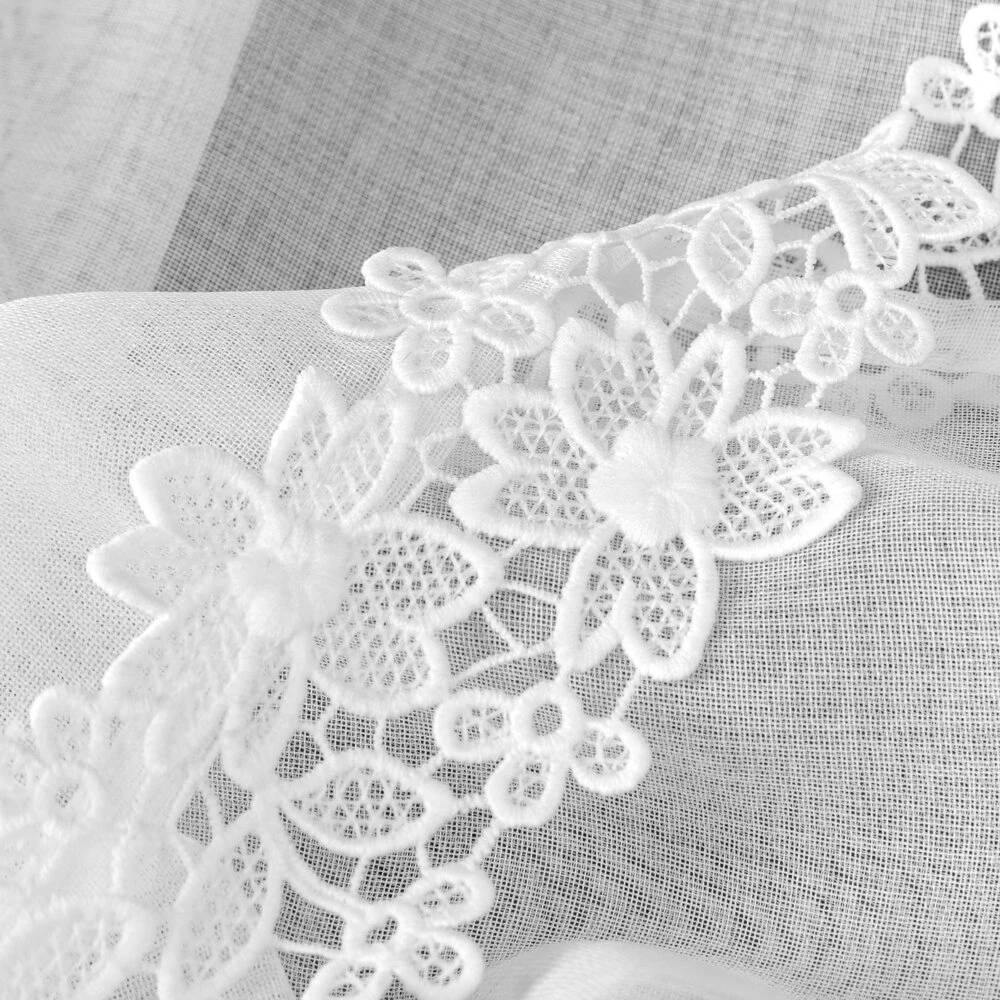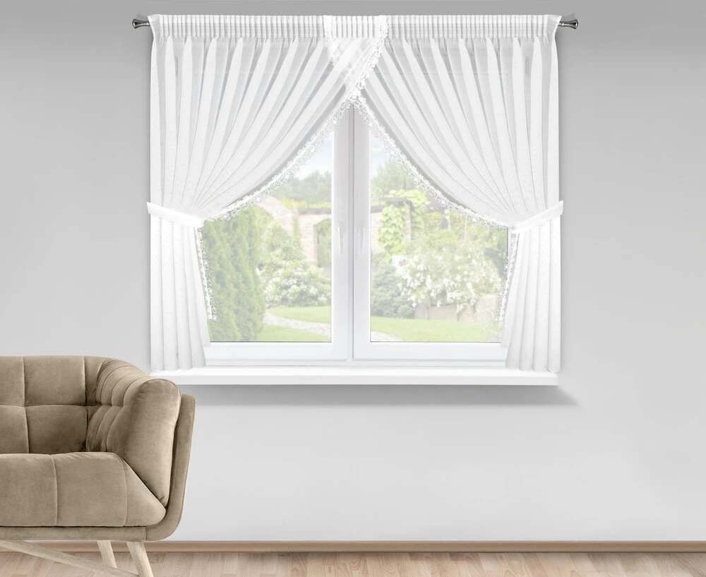 Firana gotowa zdobiona obszywką z troczkami szerokość: 400 cm, długość: 160 cm, kolor: biały, Gramatura: 70 GSM, Skład: 100% poliester