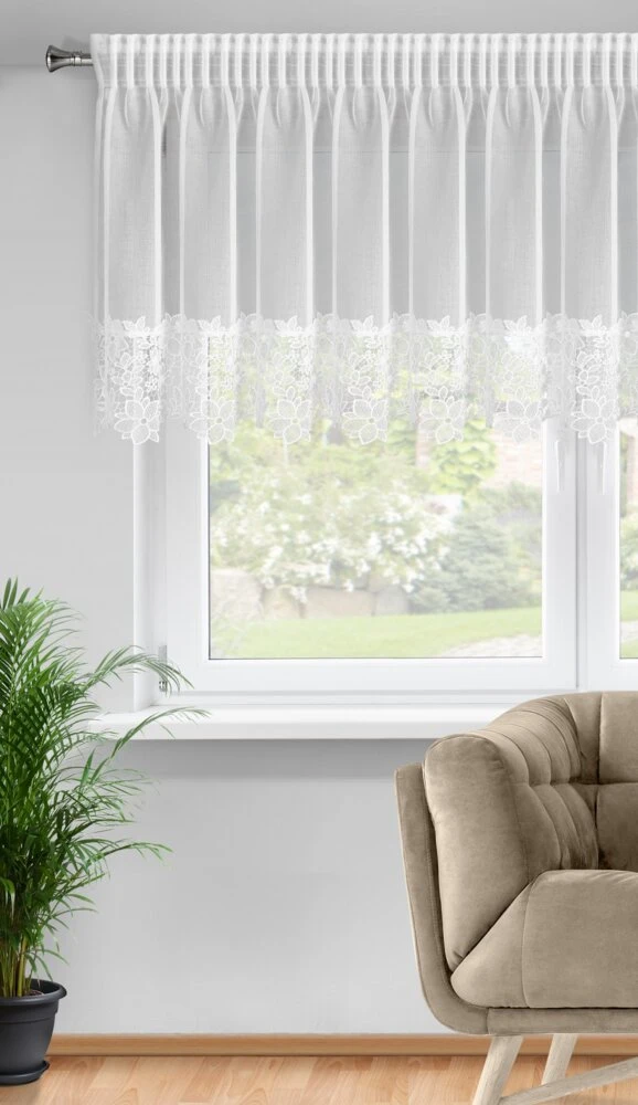 Firana gotowa zdobiona obszywką szerokość: 200 cm, długość: 70 cm, kolor: biały, Gramatura: 70 GSM, Skład: 100% poliester