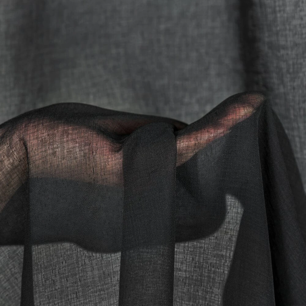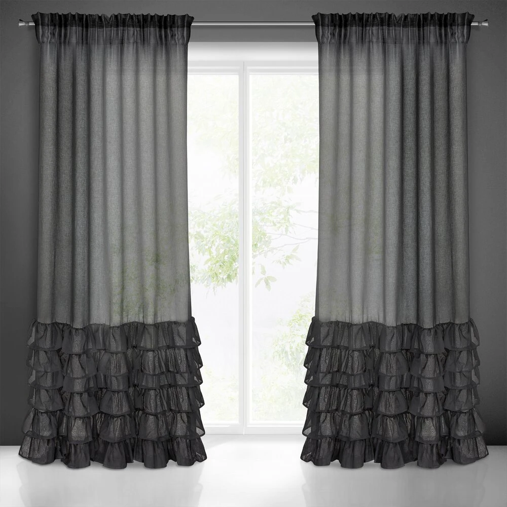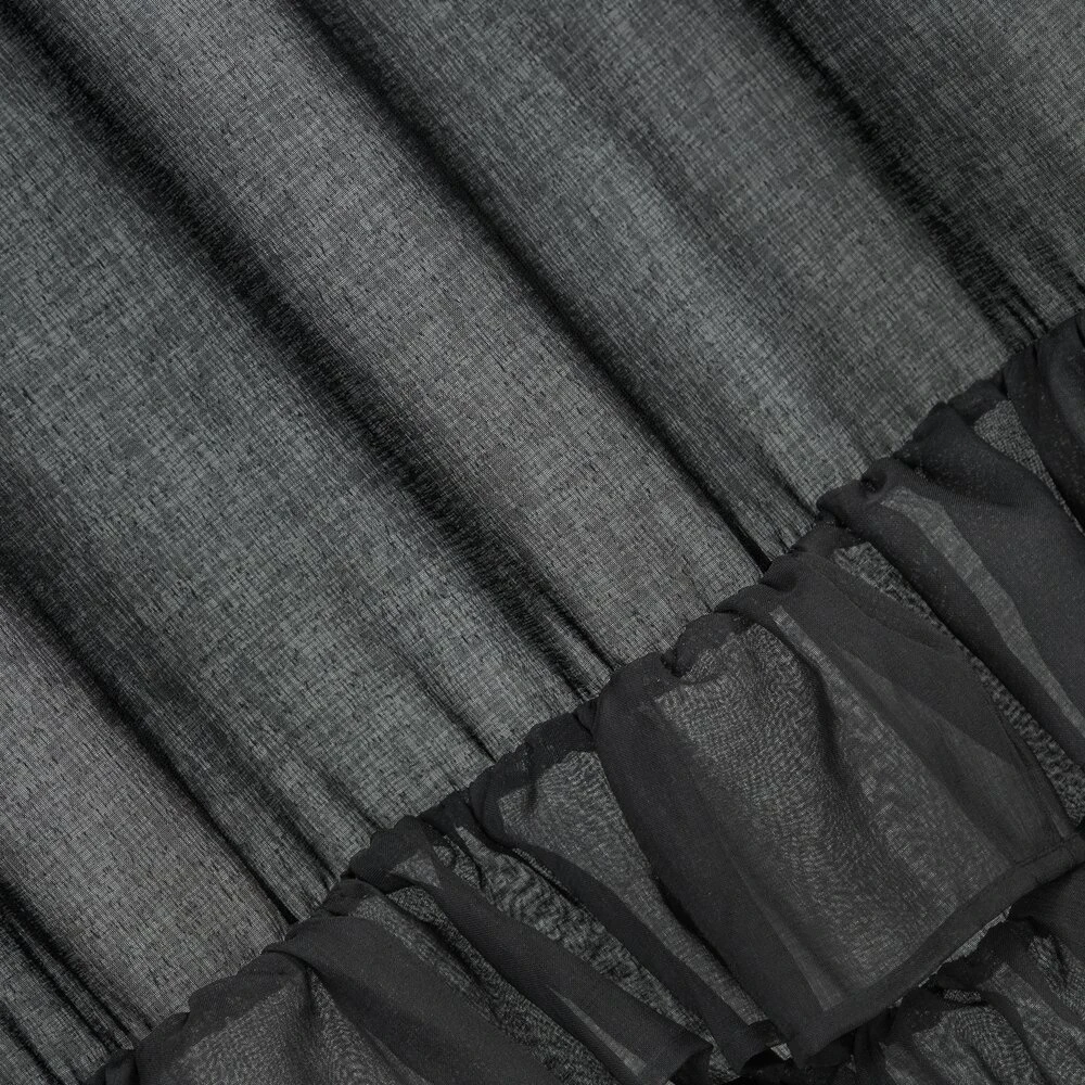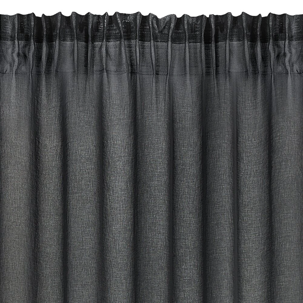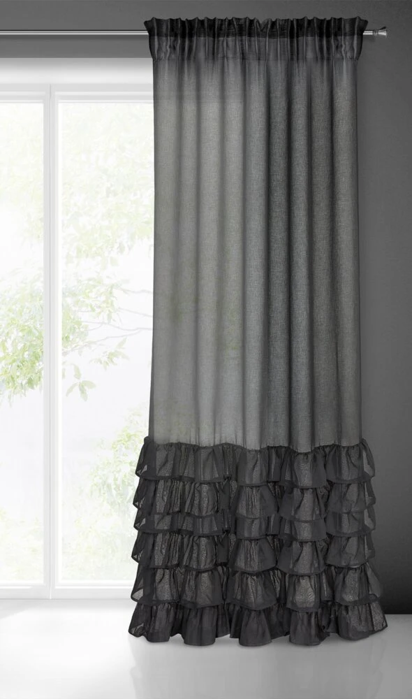 Gładka firana zdobiona falbanami posiadająca taśmę tunelową szerokość: 140 cm, długość: 250 cm, kolor: czarny, Gramatura: 80 GSM, Skład: 100% poliester