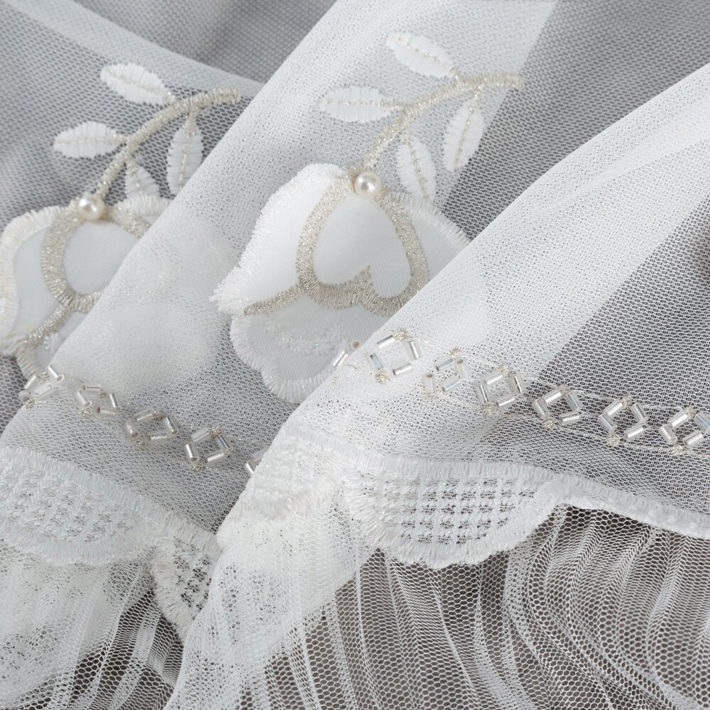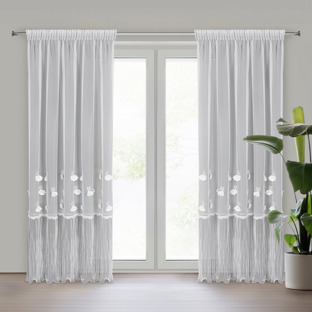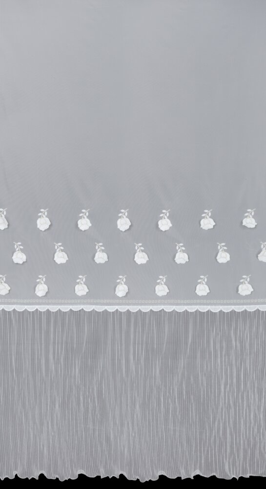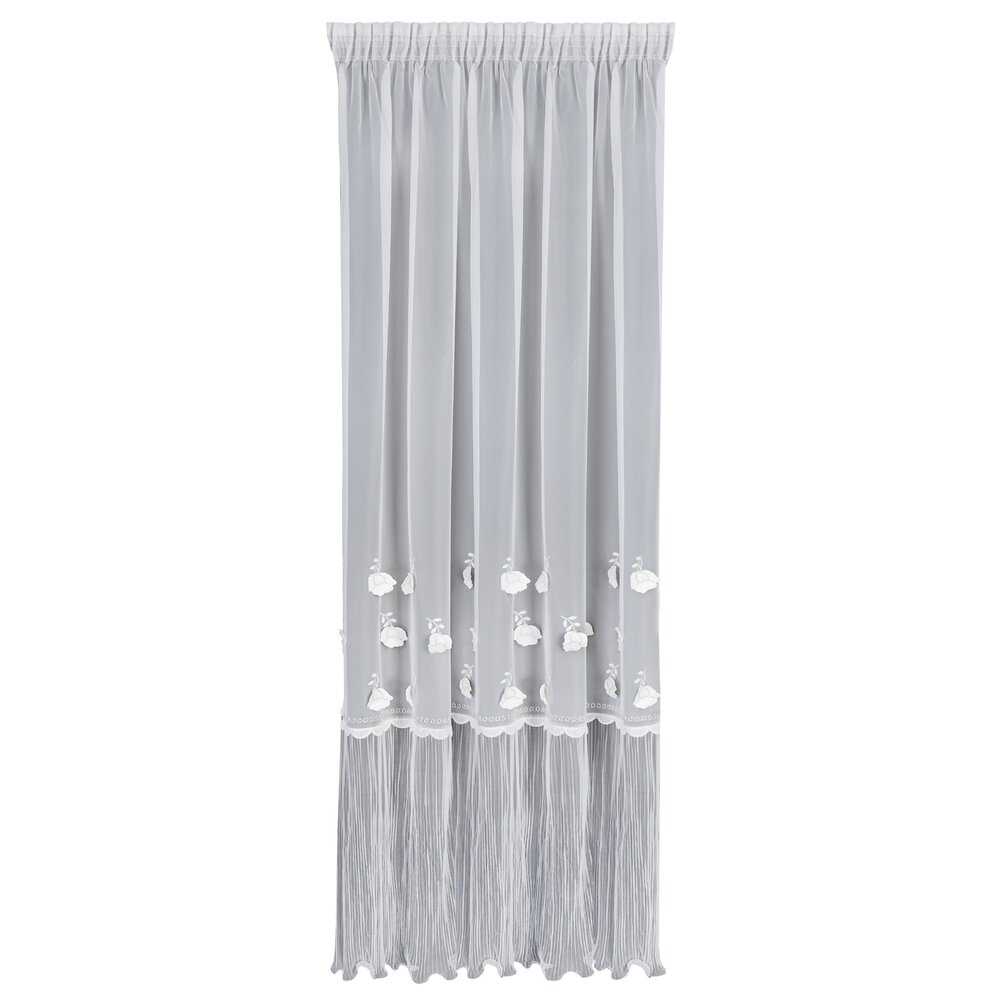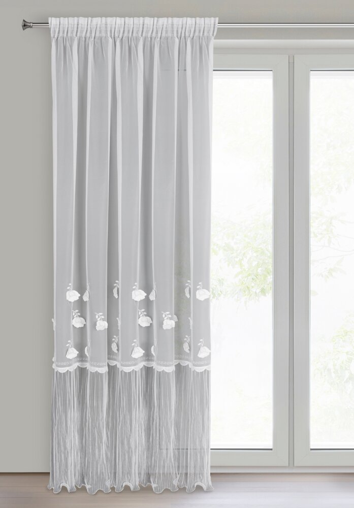 Firana gotowa zdobiona kwiatowymi aplikacjami oraz falbaną u dołu szerokość: 140 cm, długość: 270 cm, kolor: biały, Gramatura: 50 GSM, Skład: 100% poliester