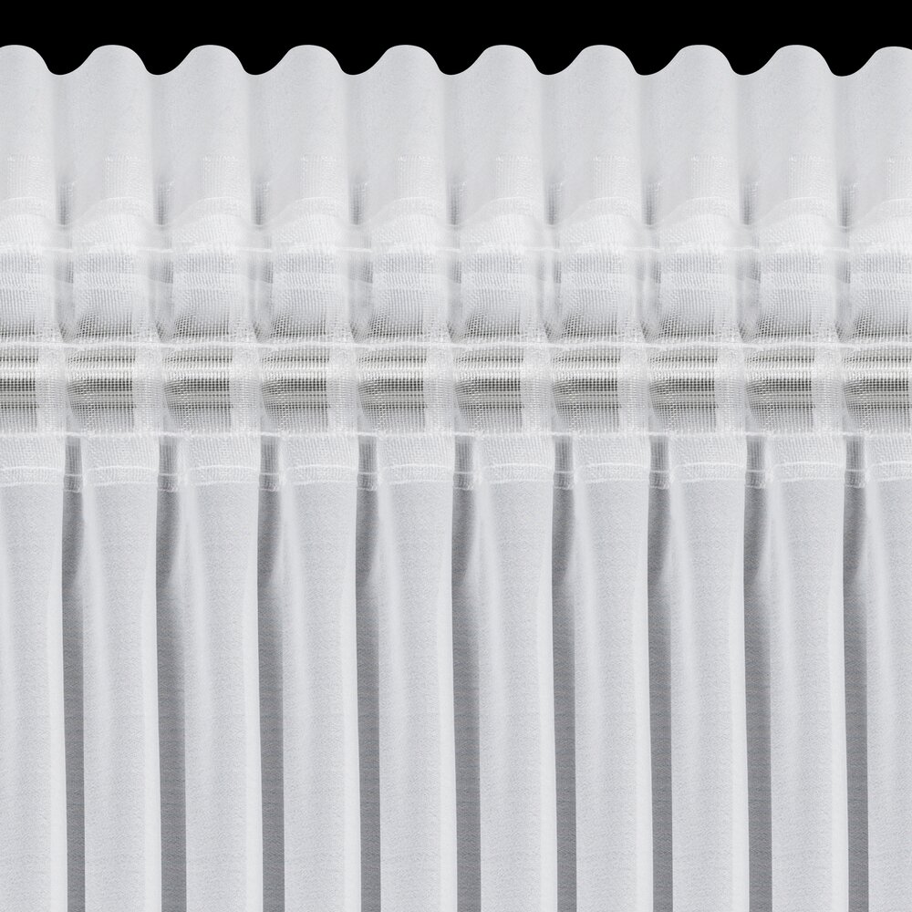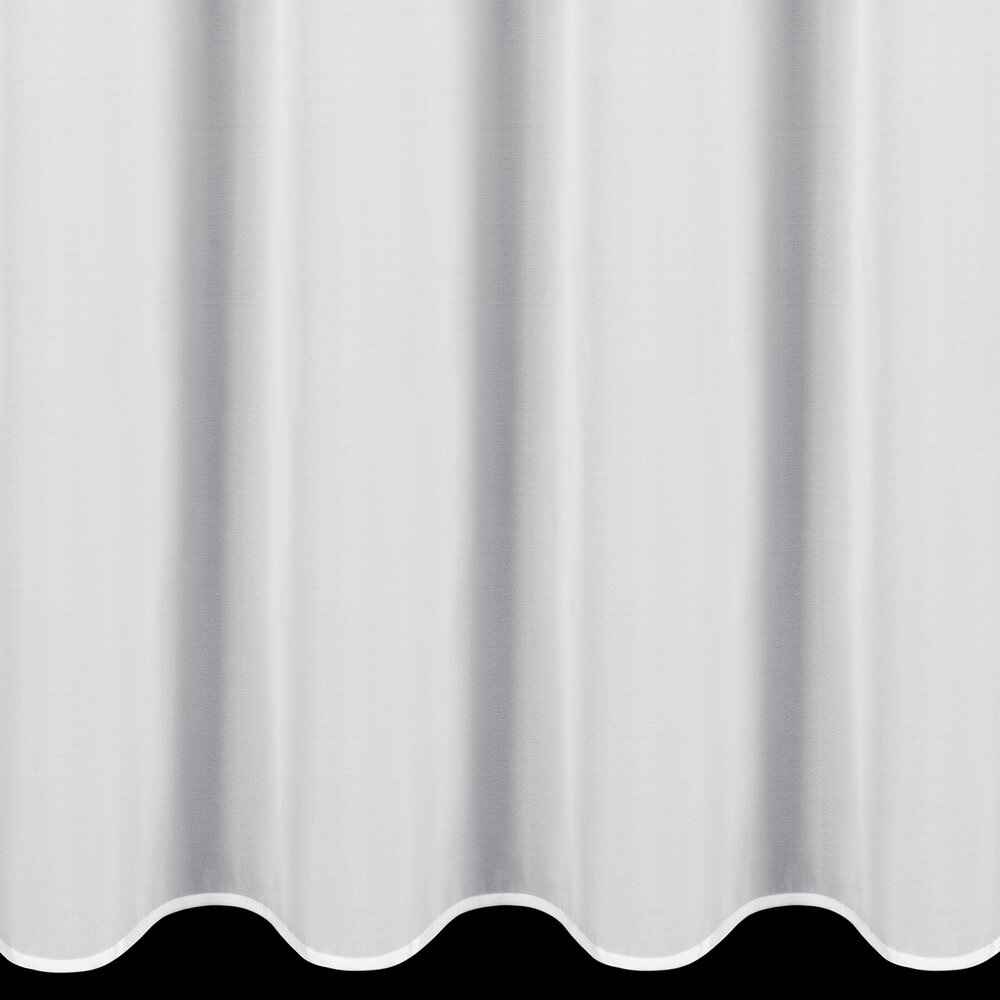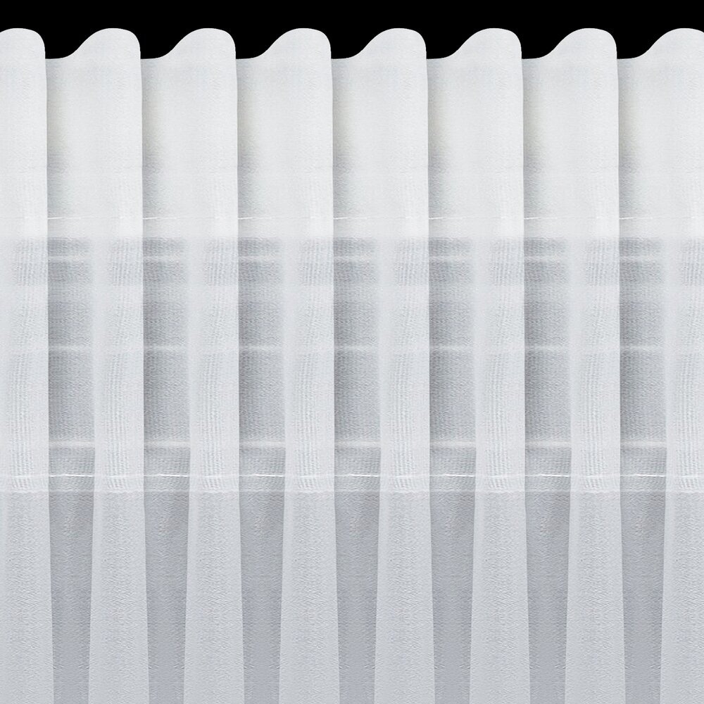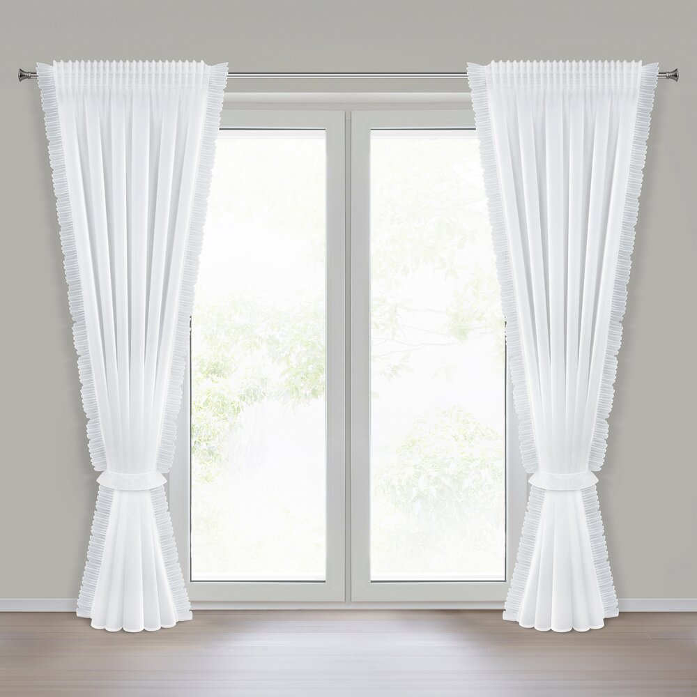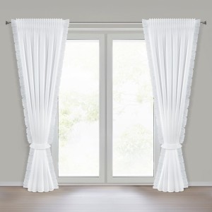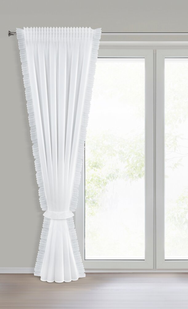 Firana gotowa zdobiona po bokach falbankami z dekoracyjnym troczkiem szerokość: 140 cm, długość: 270 cm, kolor: biały, Gramatura: 40 GSM, Skład: 100% poliester
