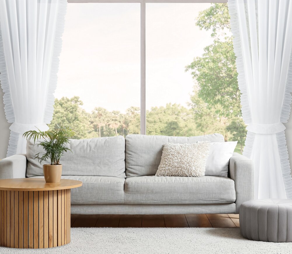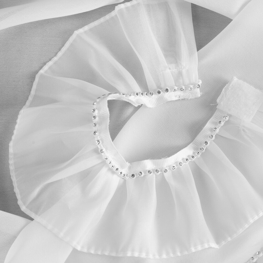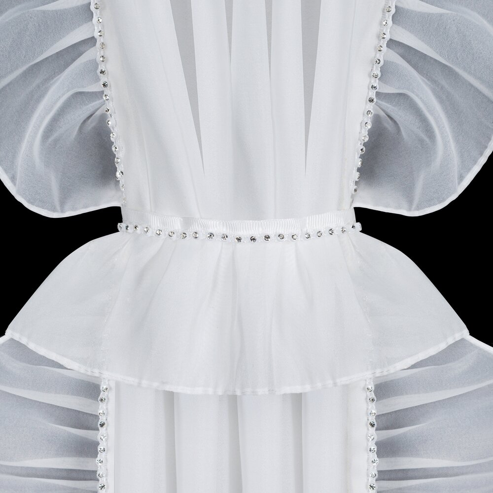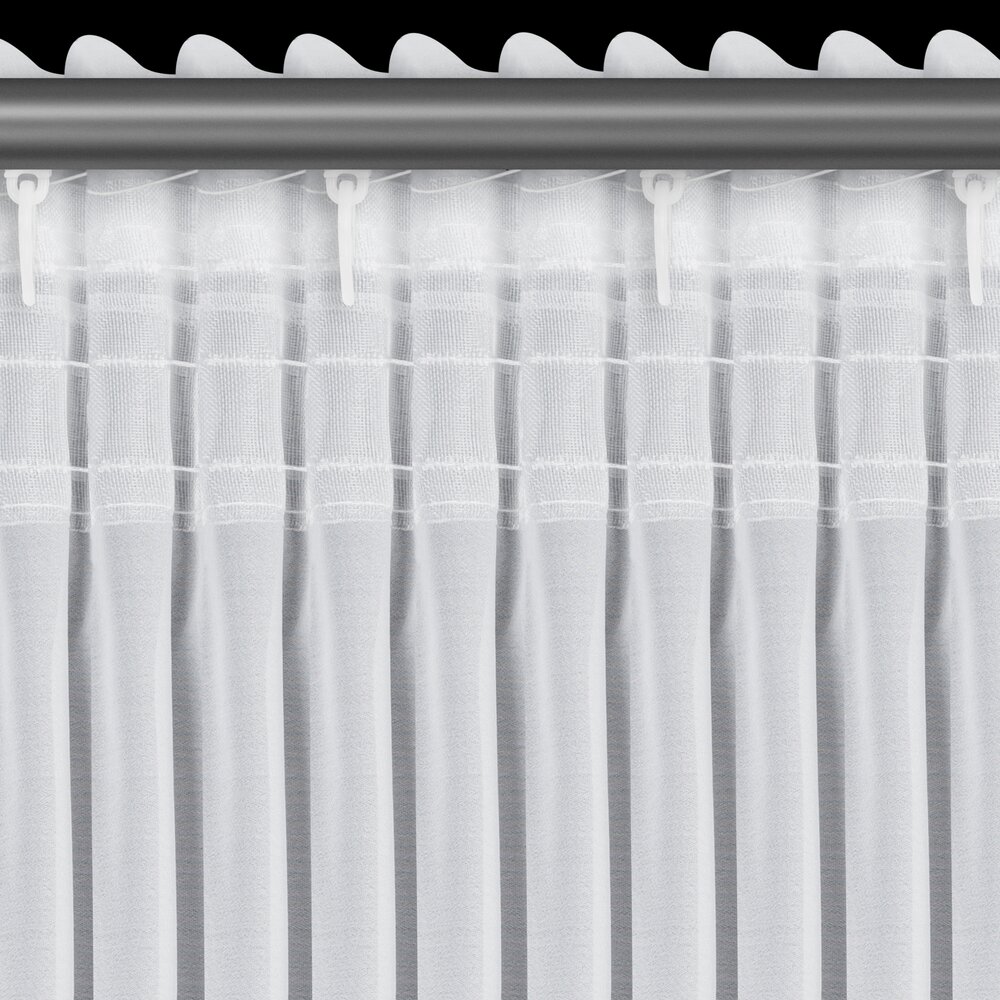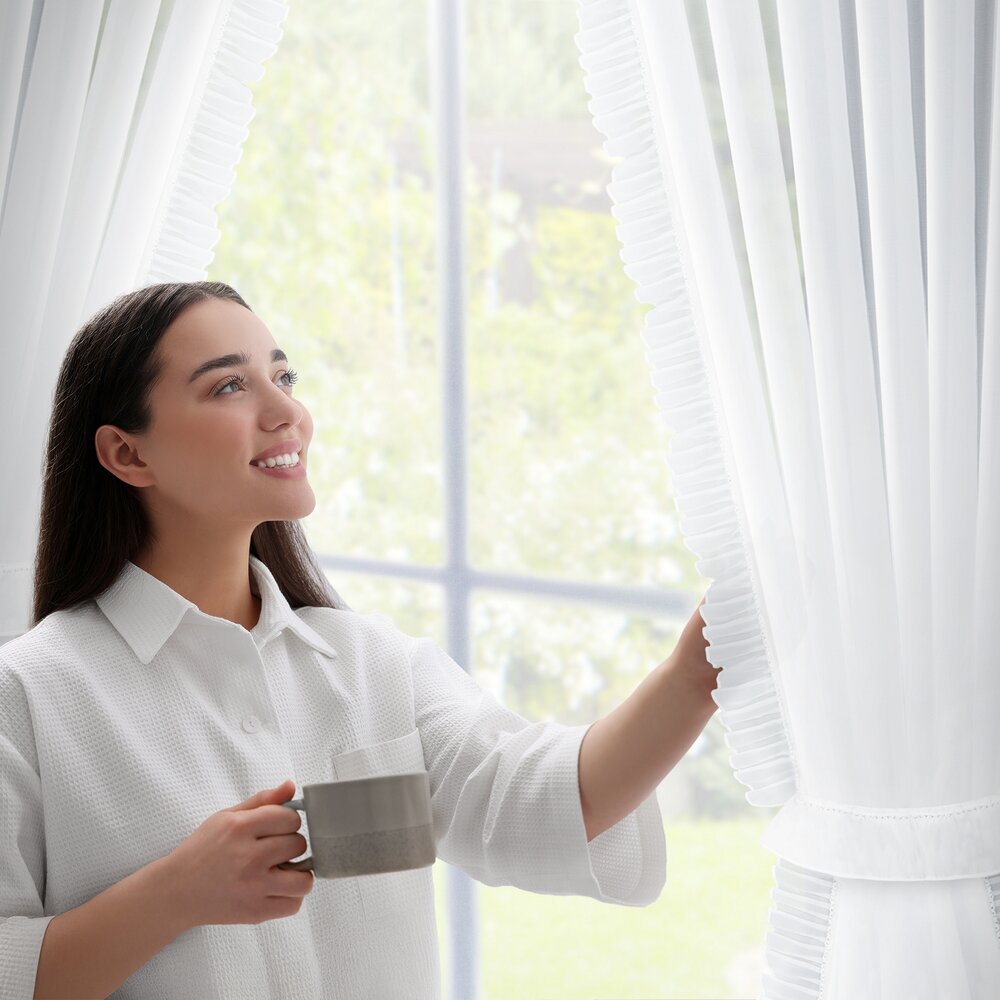 Firana gotowa zdobiona po bokach falbankami z dekoracyjnym troczkiem szerokość: 140 cm, długość: 270 cm, kolor: biały, Gramatura: 40 GSM, Skład: 100% poliester