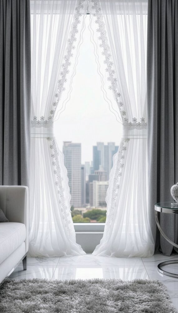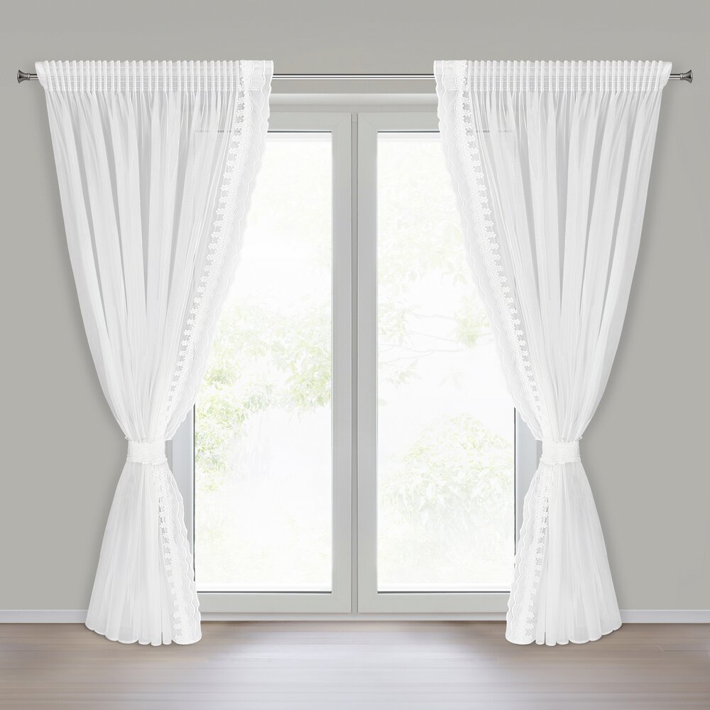 Komplet firan gotowych zdobiony obszywką szerokość: 140 cm, długość: 270 cm, kolor: biały, Gramatura: 80 GSM, Skład: 100% poliester