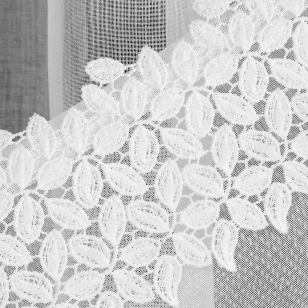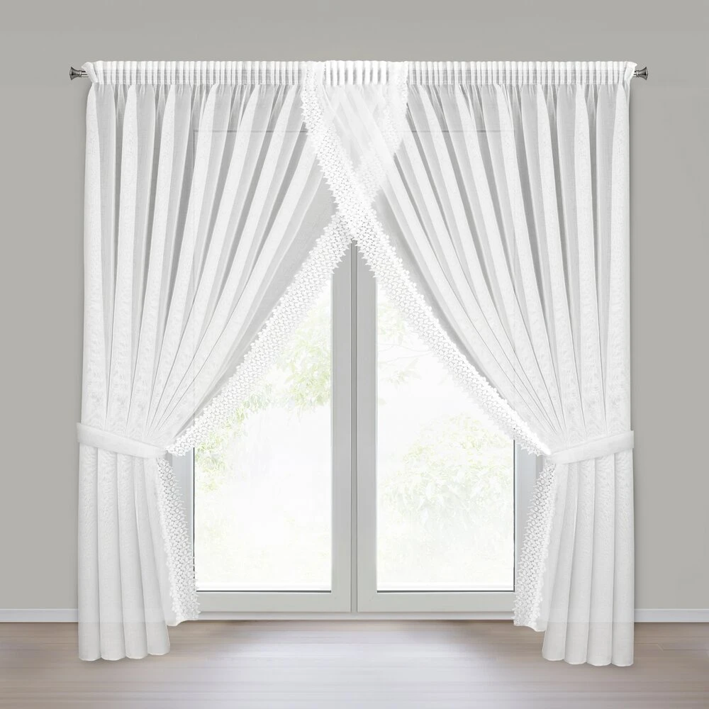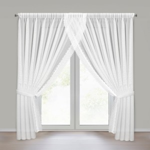 Firana gotowa zdobiona obszywką z troczkami szerokość: 400 cm, długość: 250 cm, kolor: biały, Gramatura: 70 GSM, Skład: 100% poliester