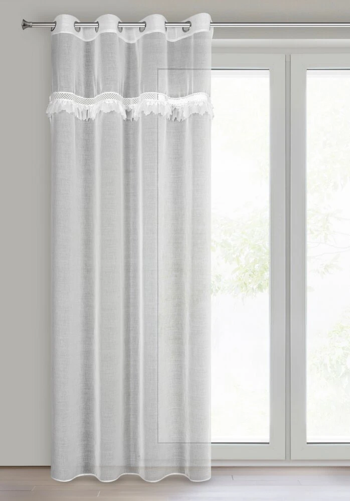 Firana gotowa zdobiona obszywką szerokość: 140 cm, długość: 250 cm, kolor: biały, Gramatura: 68 GSM, Skład: 100% poliester