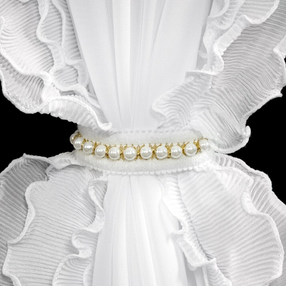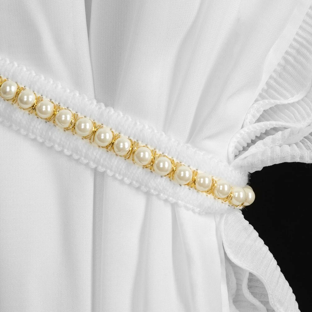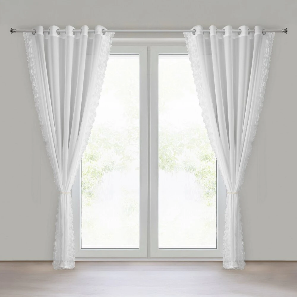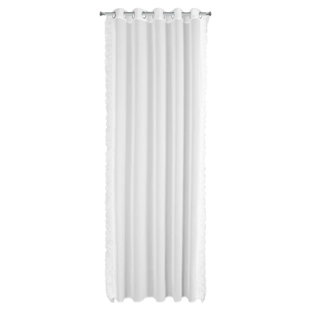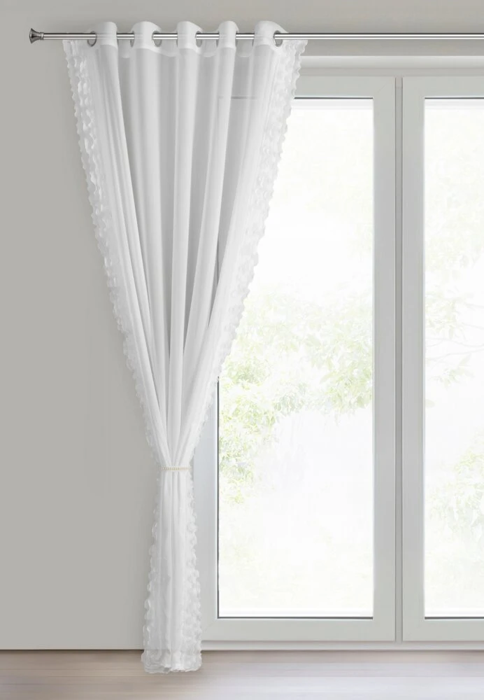 Firana gotowa zdobiona aplikacją z dekoracyjnym troczkiem szerokość: 140 cm, długość: 250 cm, kolor: biały, Gramatura: 60 GSM, Skład: 100% poliester