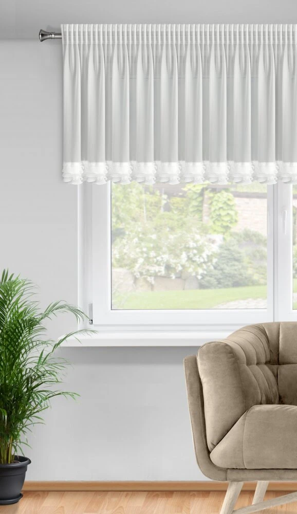Firana gotowa zdobiona aplikacją szerokość: 200 cm, długość: 70 cm, kolor: biały, Gramatura: 60 GSM, Skład: 100% poliester