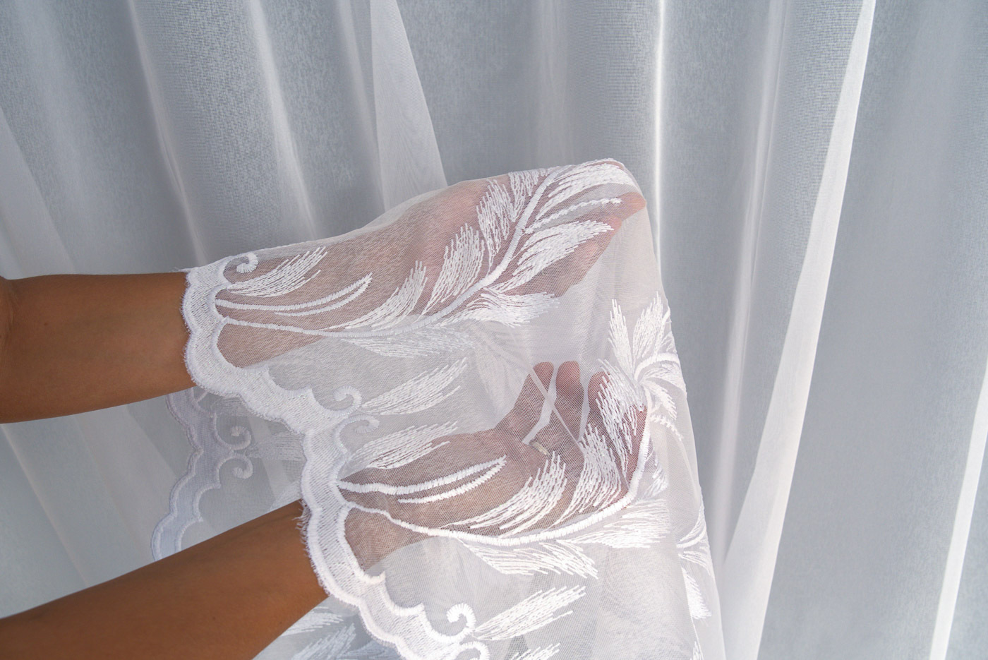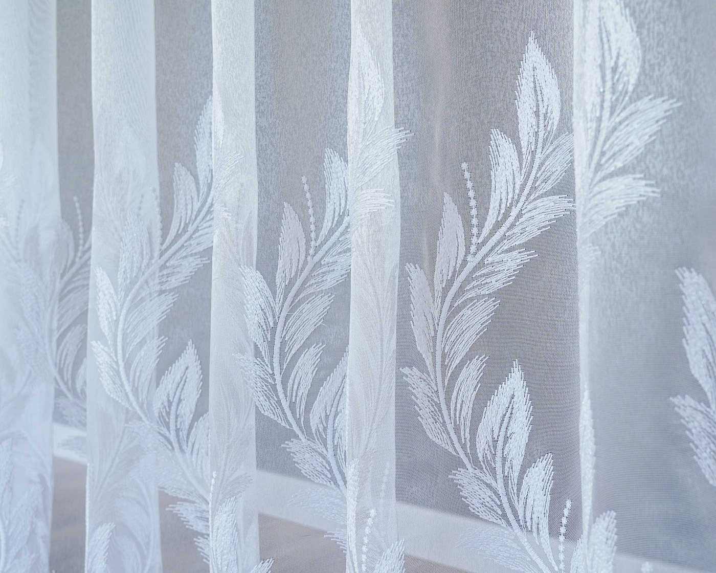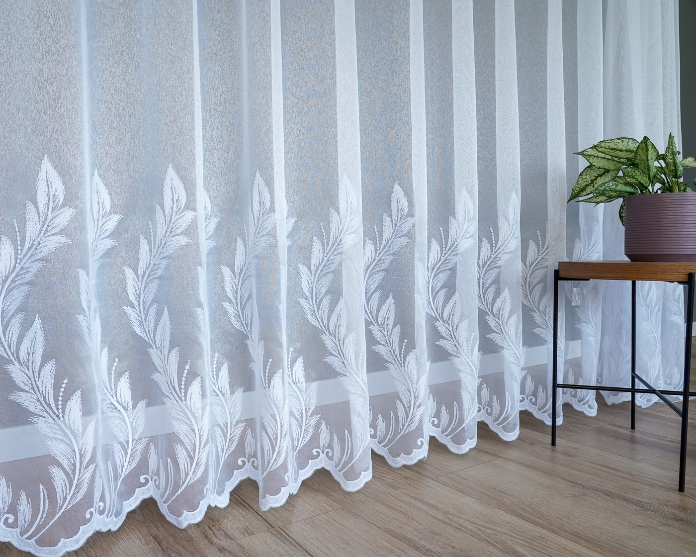 Biała markizeta o wysokości 280 cm z dwoma pasami haftu to połączenie delikatności i wyrafinowanego detalu. Subtelny, roślinny haft pięknie rozkłada się w dwóch poziomach – w dolnej części oraz wyżej, tworząc harmonijną kompozycję na całej wysokości firany.