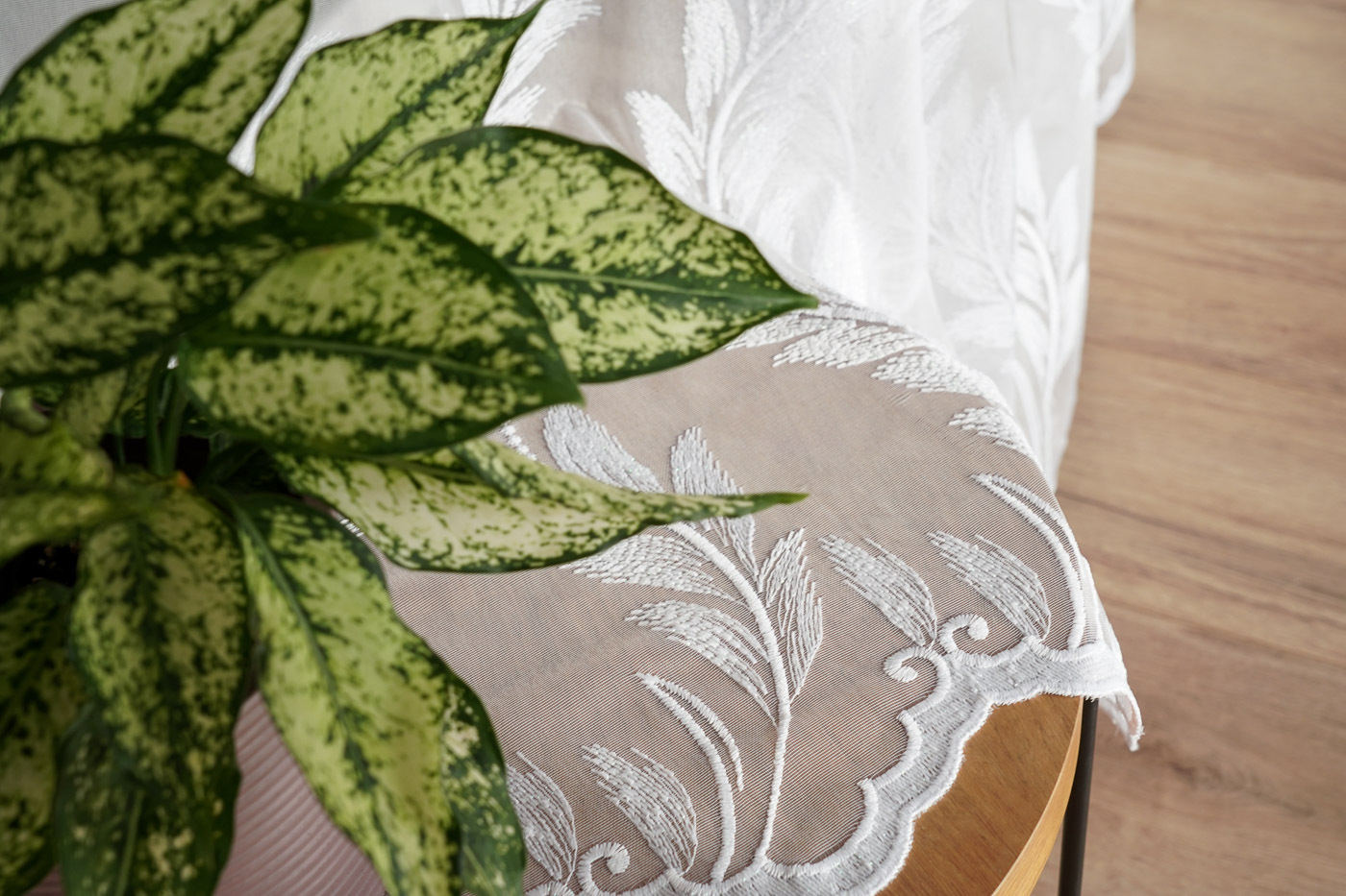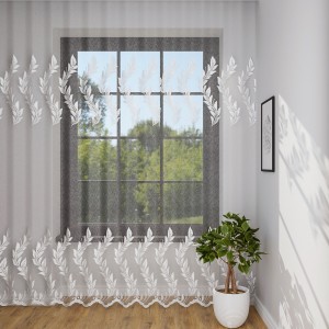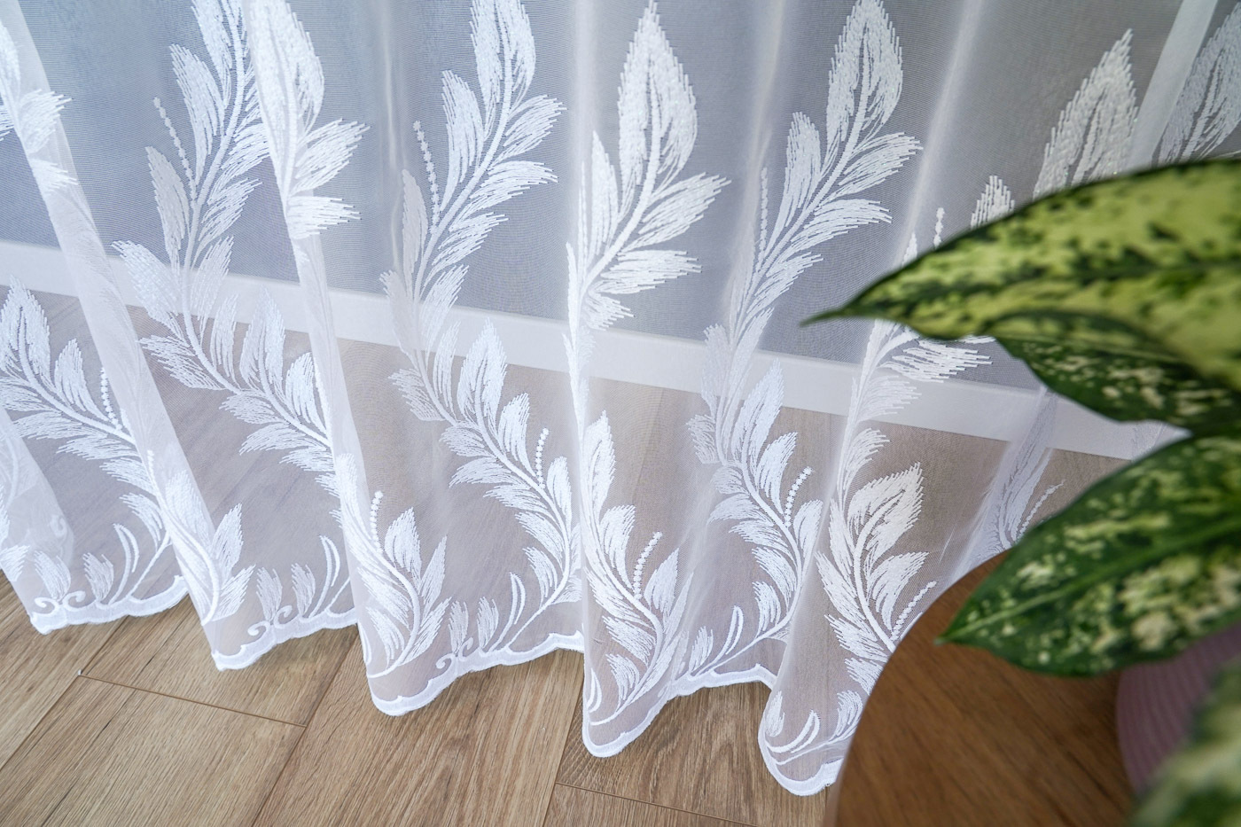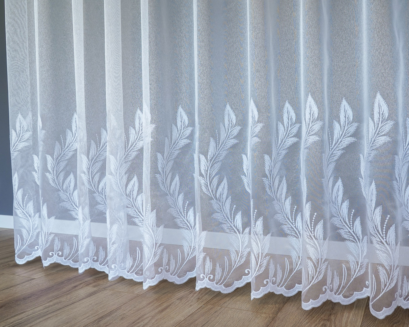 Biała markizeta o wysokości 280 cm z dwoma pasami haftu to połączenie delikatności i wyrafinowanego detalu. Subtelny, roślinny haft pięknie rozkłada się w dwóch poziomach – w dolnej części oraz wyżej, tworząc harmonijną kompozycję na całej wysokości firany.