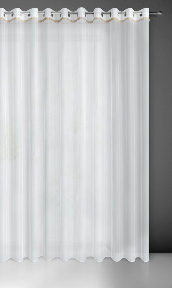 Firana gotowa z ozdobną tasiemką szerokość: 300 cm, długość: 250 cm, kolor: biały, Gramatura: 35 GSM, Skład: 100% poliester