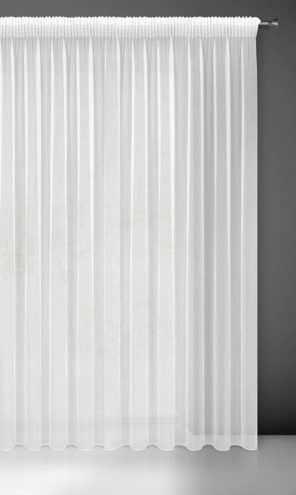 Delikatna firana w pięknym kolorze uszyta z tkaniny o strukturze drobnego deszczyku doskonale przepuszcza światło. Łatwa w prasowaniu i praniu dekoracja. szerokość: 350 cm, długość: 270 cm, kolor: biały, Gramatura: 50 GSM, Skład: 100% poliester