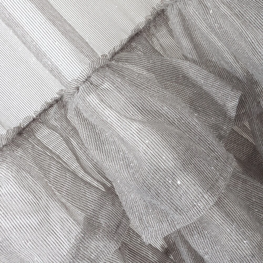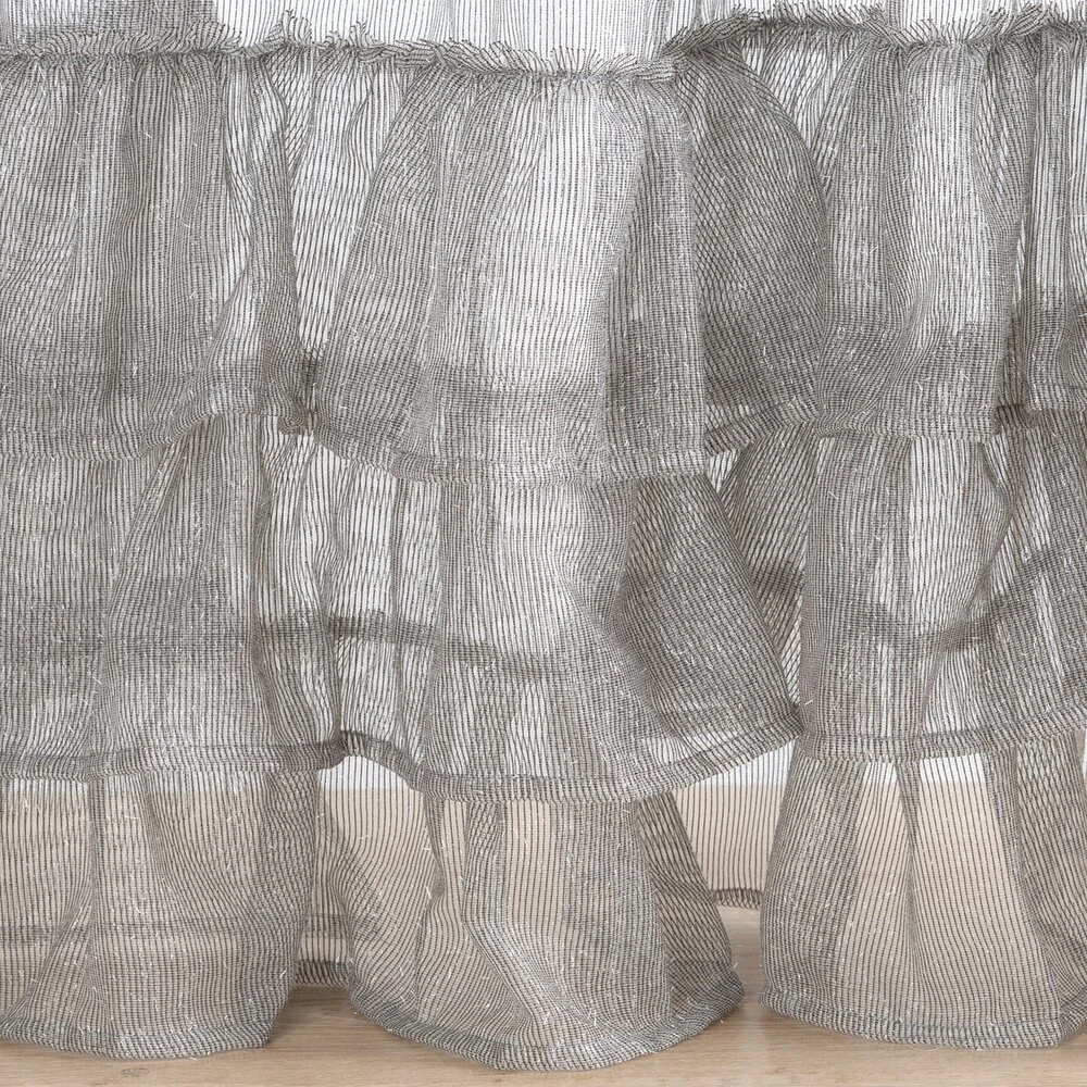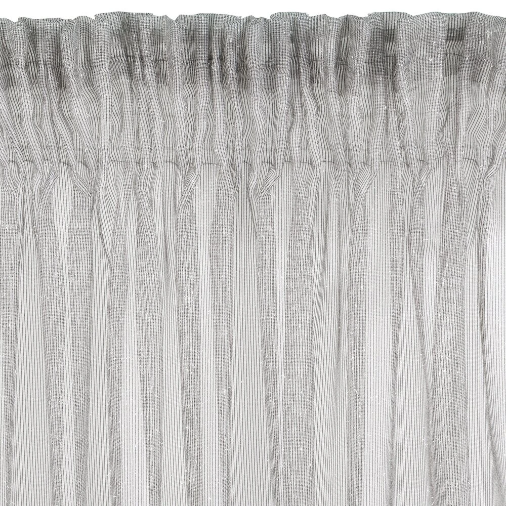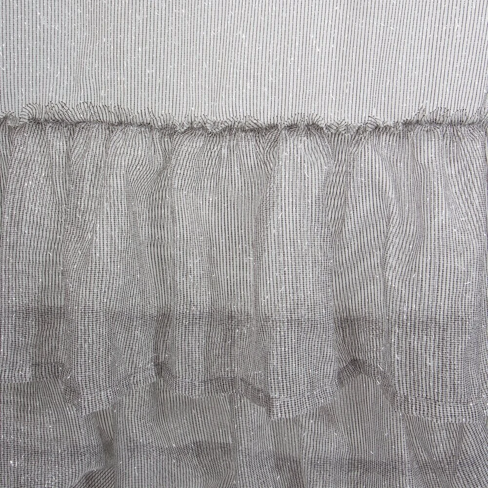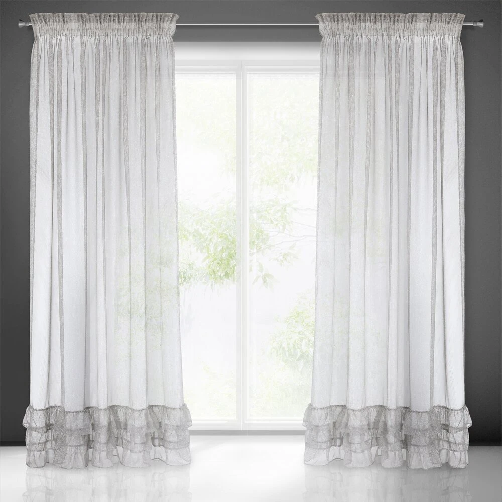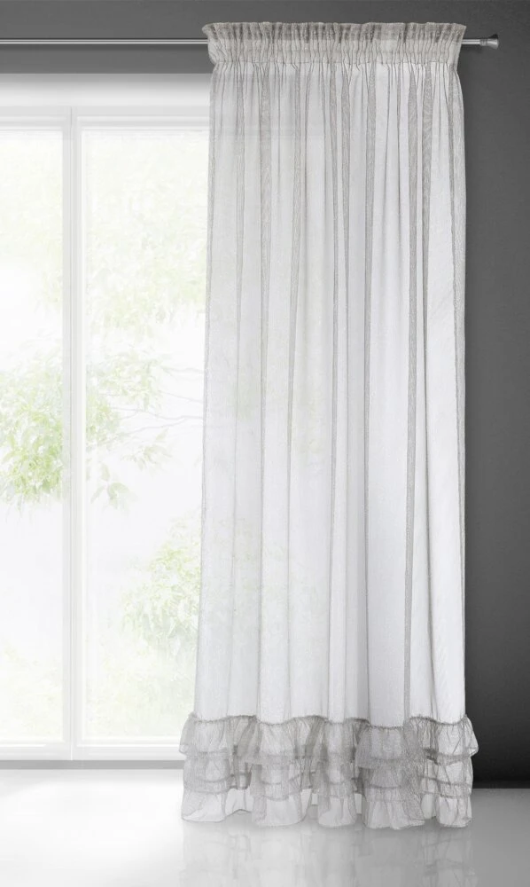 Lekka i bardzo subtelna firana o kobiecym charakterze. Jednokolorowa dekoracja zdobiona jest srebrną, lśniącą nicią i 3 sutymi falbanami w dolnej części firany. szerokość: 140 cm, długość: 270 cm, kolor: szary, Gramatura: 50 GSM, Skład: 100% poliester