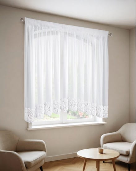 Firana ROSES 8 została zaprojektowana z myślą o wnętrzach, które potrzebują światła, ale nie chcą rezygnować z dekoracyjnego charakteru okna.