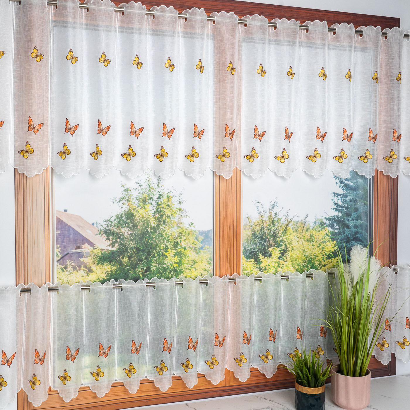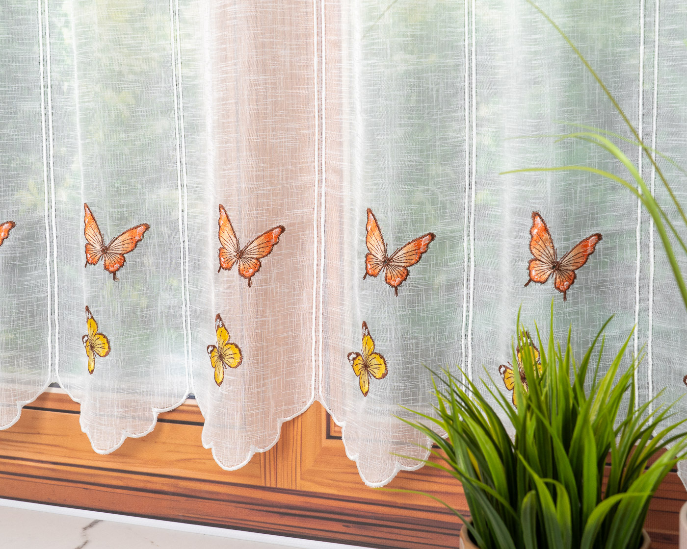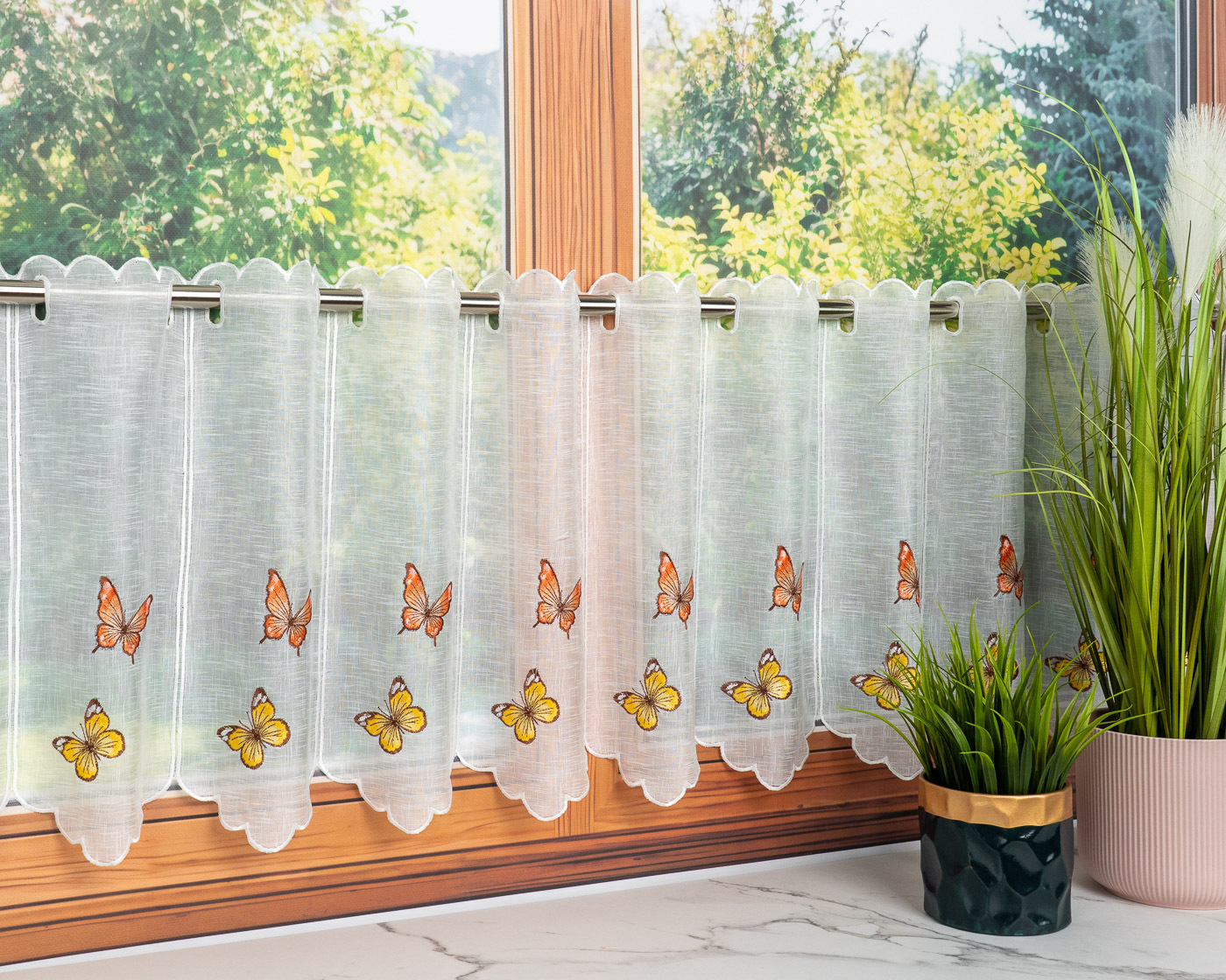 Delikatna, półtransparentna tkanina subtelnie przepuszcza światło, a haftowane motylki w ciepłych odcieniach żółci i pomarańczy dodają wnętrzu świeżości i lekkości. To idealna firanka do kuchni, jeśli chcesz, żeby było jasno, przytulnie i po prostu „ładnie”.