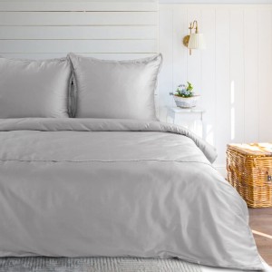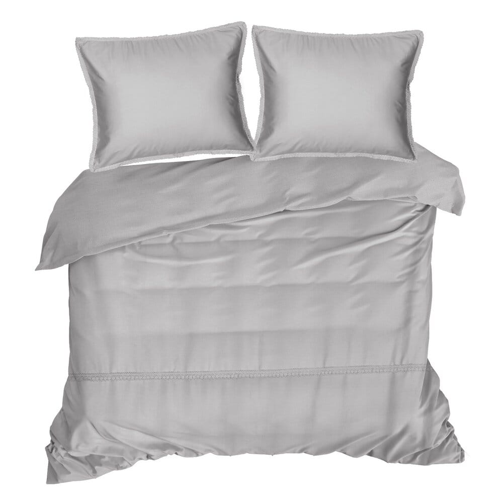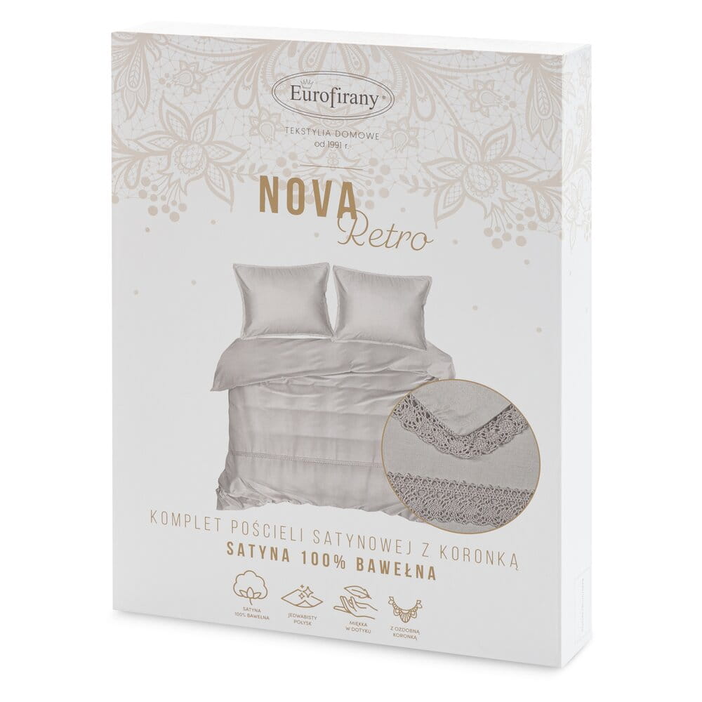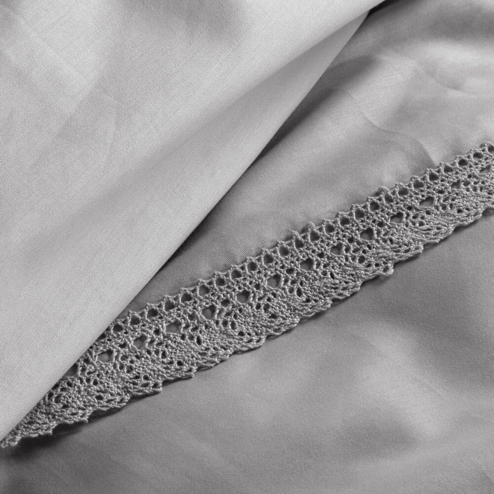 Komplet pościeli z satyny bawełnianej z koronką, pakowana w pudełku szerokość: 220 cm, długość: 200 cm, kolor: jasnoszary, Gramatura: 115 GSM, Skład: satyna, 100% bawełna