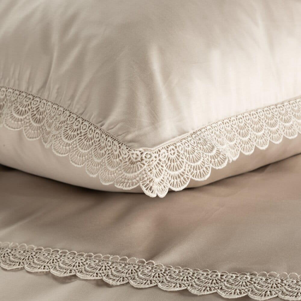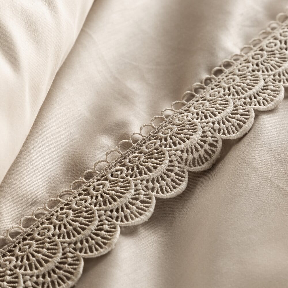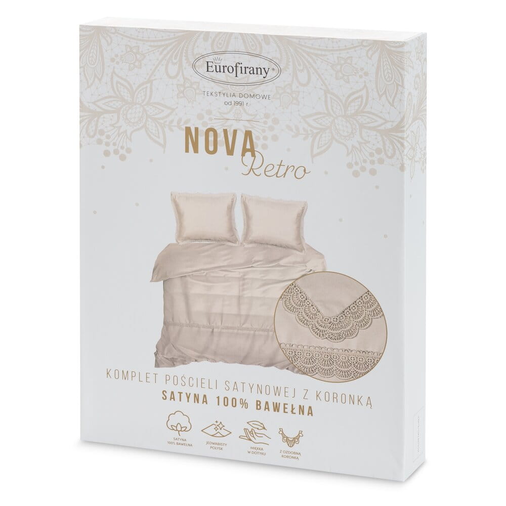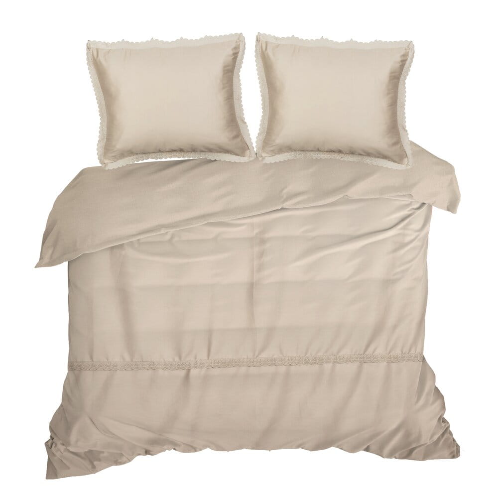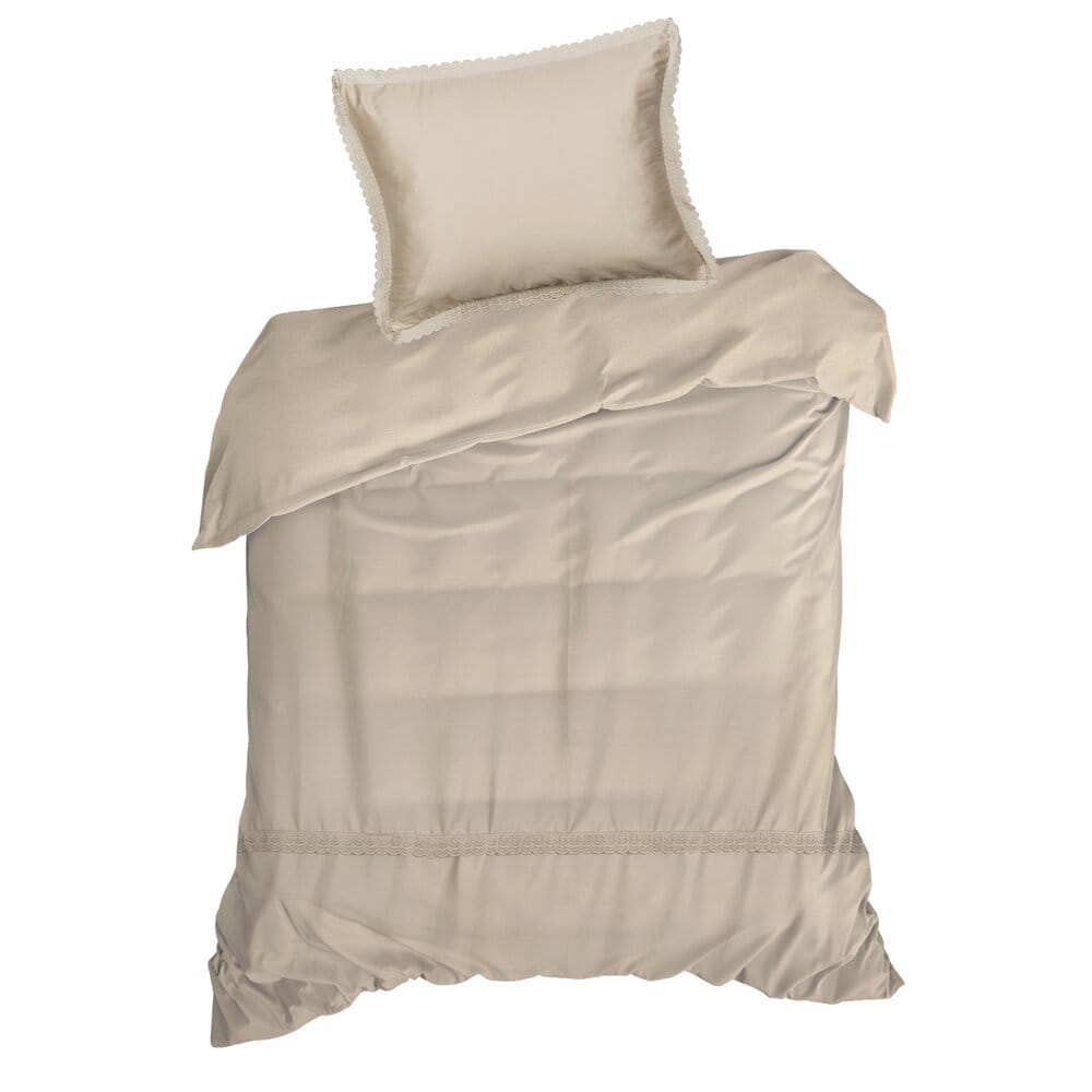 Komplet pościeli z satyny bawełnianej z koronką, pakowana w pudełku szerokość: 160 cm, długość: 200 cm, kolor: beżowy, Gramatura: 115 GSM, Skład: tkanina: satyna, 100% bawełna: część ozdobna (koronka): 100% poliester