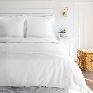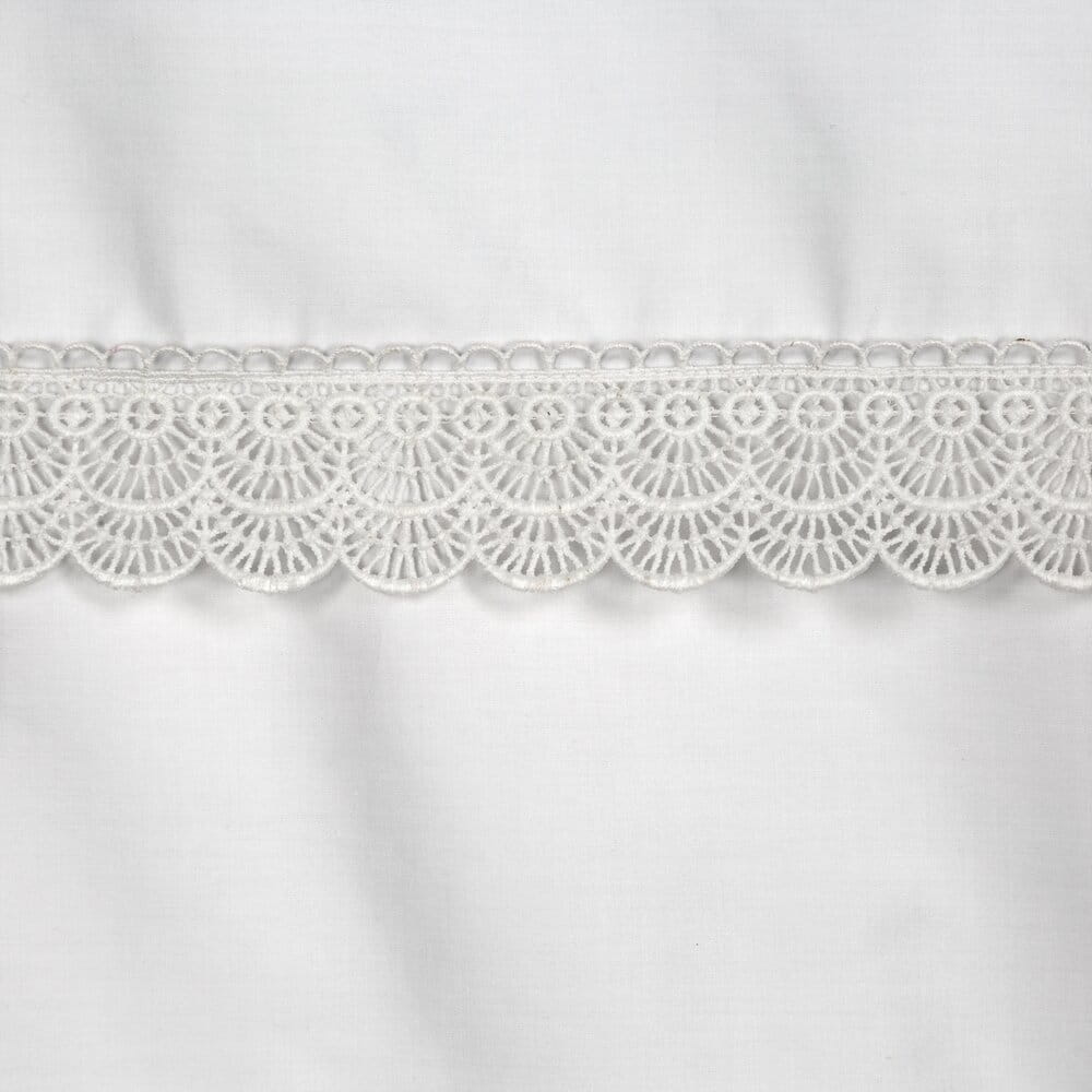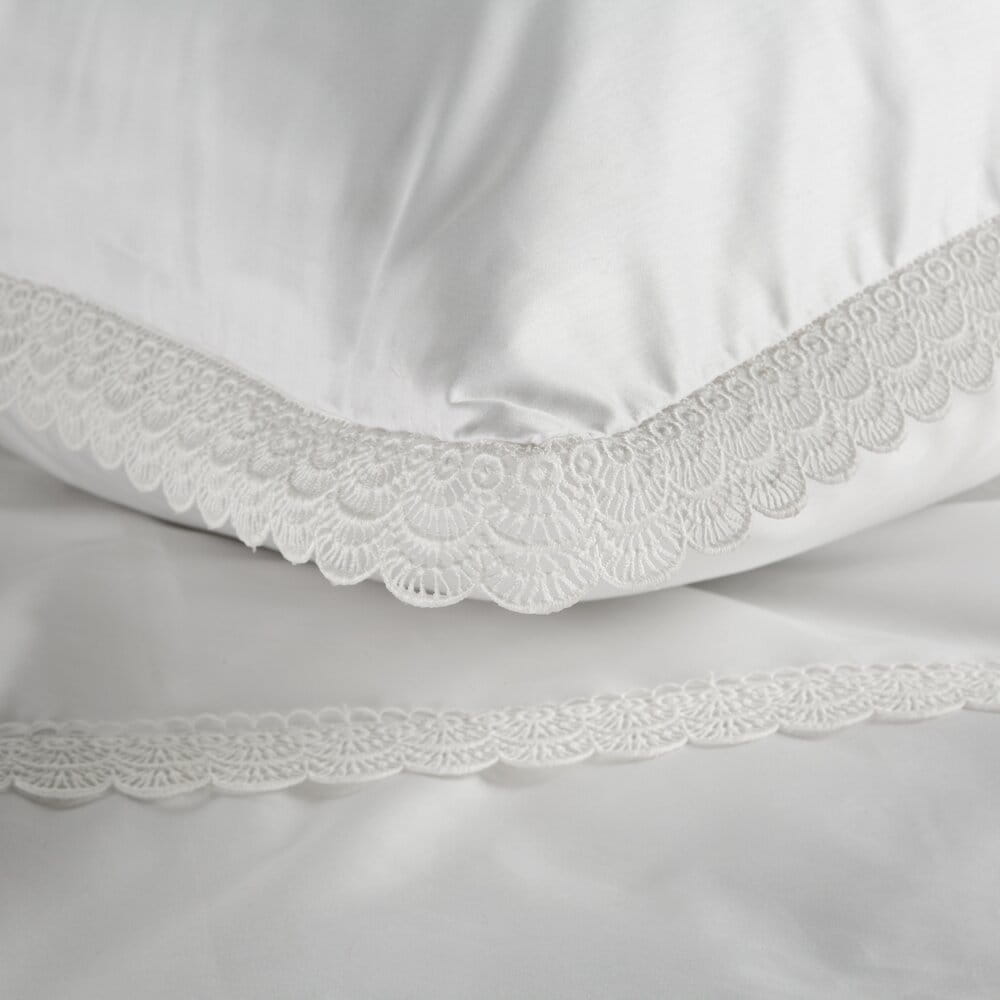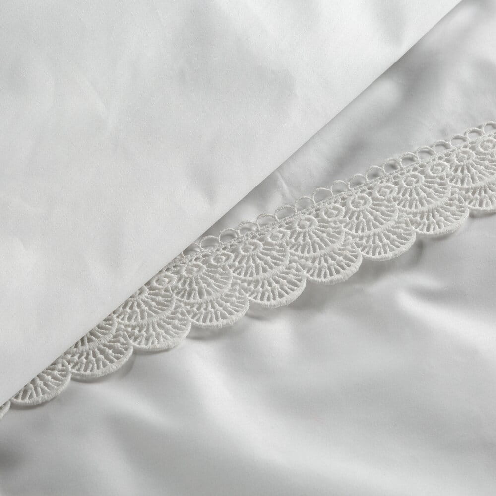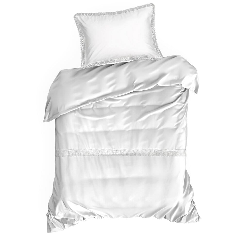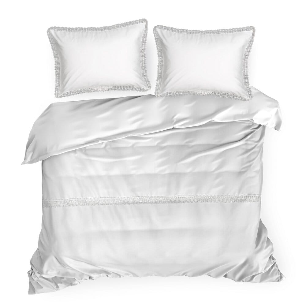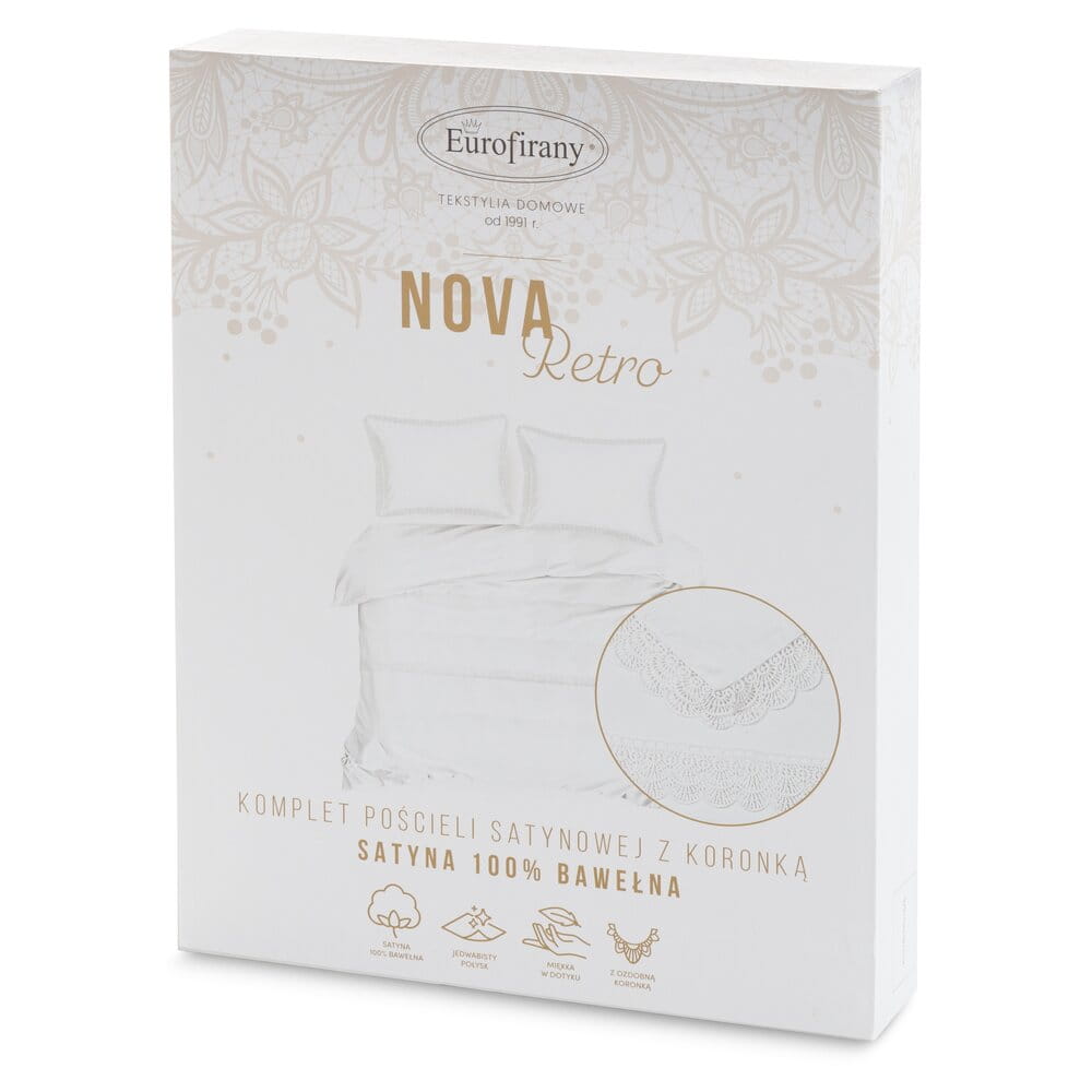 Komplet pościeli z satyny bawełnianej z koronką, pakowana w pudełku szerokość: 220 cm, długość: 200 cm, kolor: biały, Gramatura: 115 GSM, Skład: tkanina: satyna, 100% bawełna: część ozdobna (koronka): 100% poliester