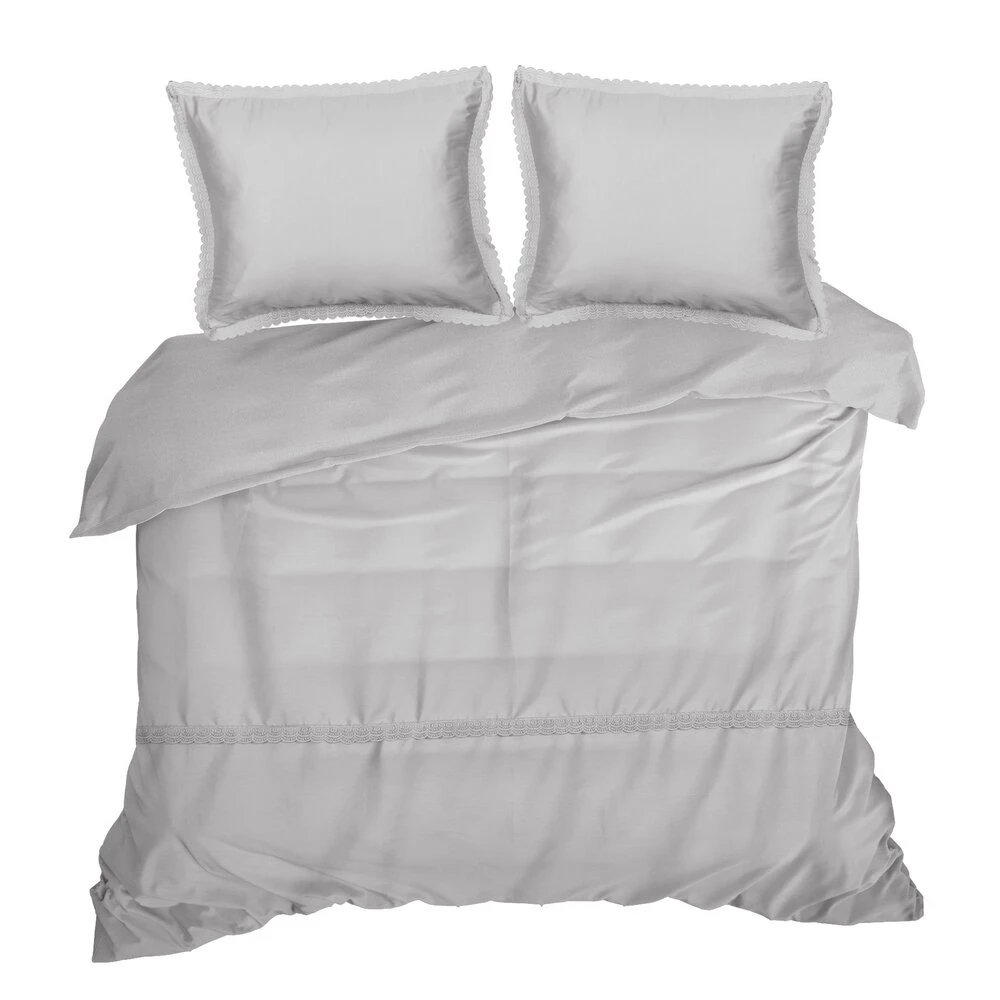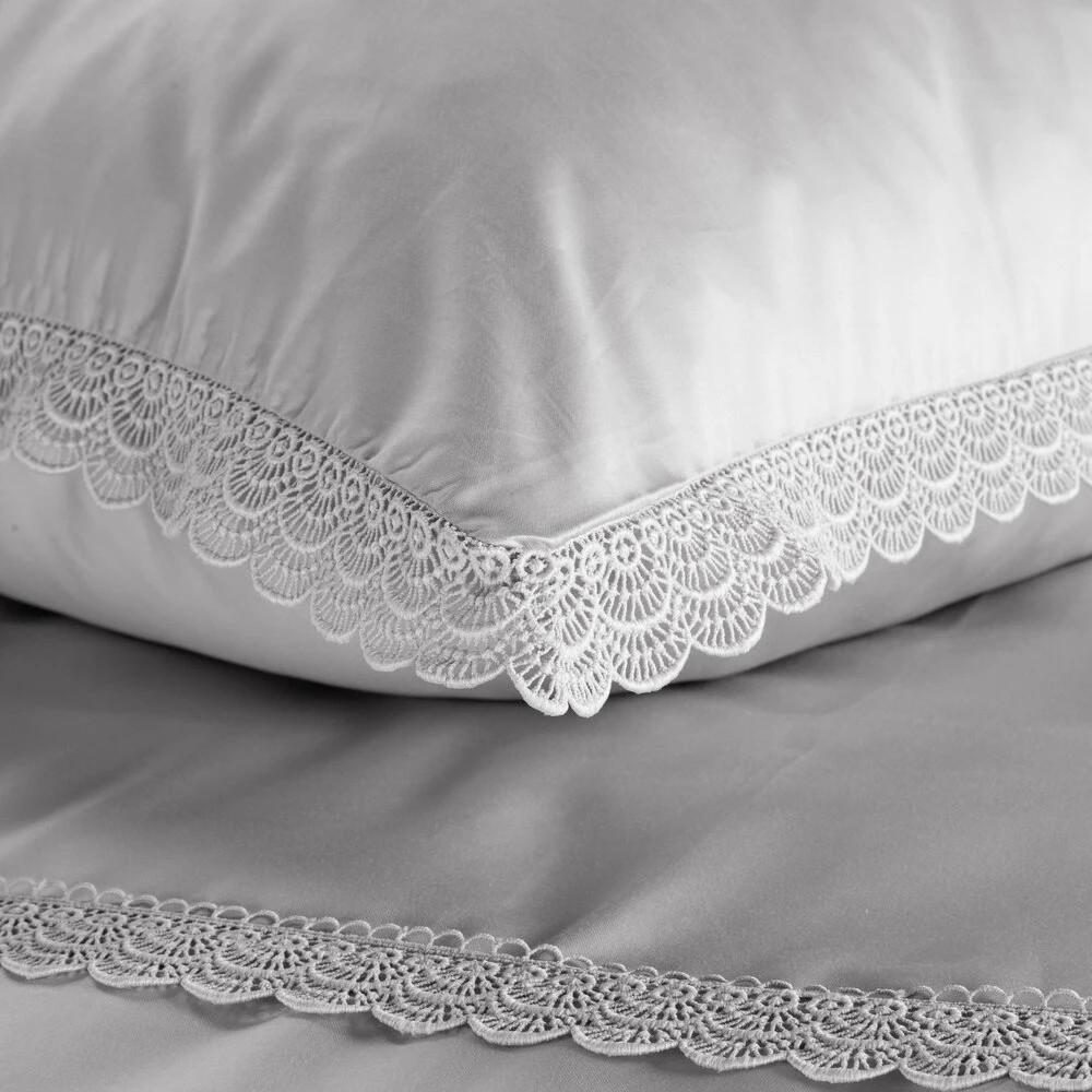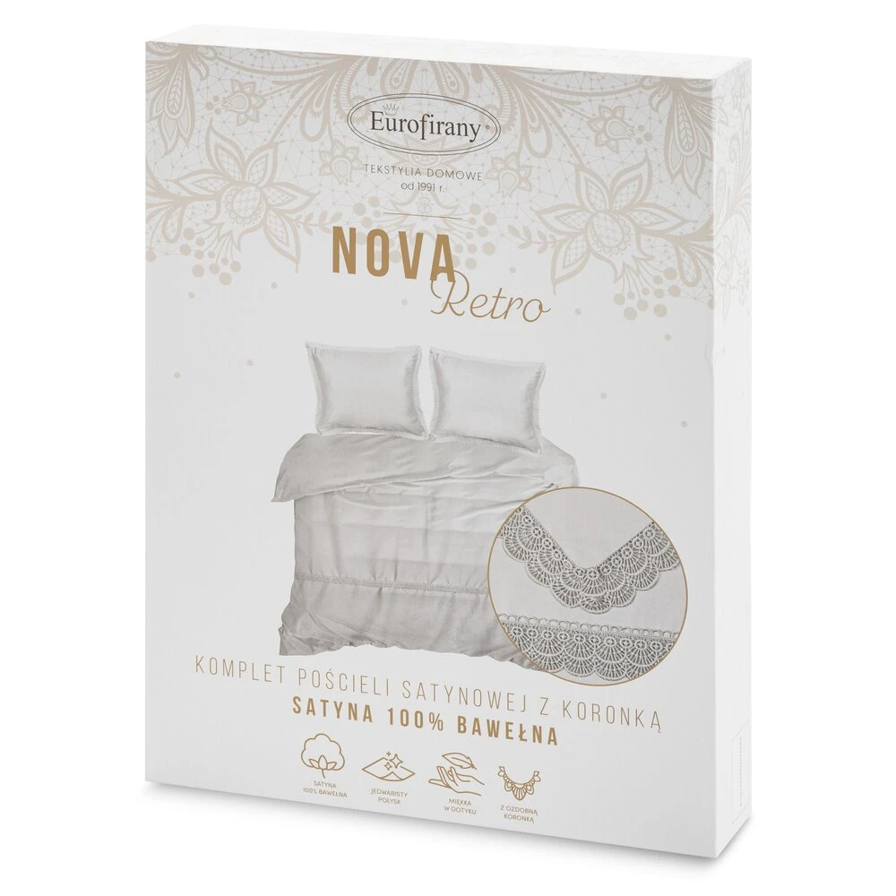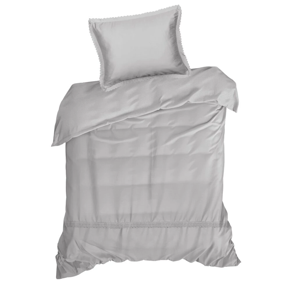 Komplet pościeli z satyny bawełnianej z koronką, pakowana w pudełku szerokość: 220 cm, długość: 200 cm, kolor: jasnoszary, Gramatura: 115 GSM, Skład: tkanina: satyna, 100% bawełna: część ozdobna (koronka): 100% poliester