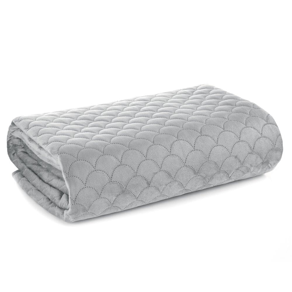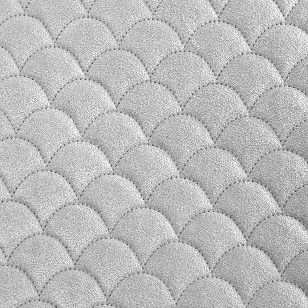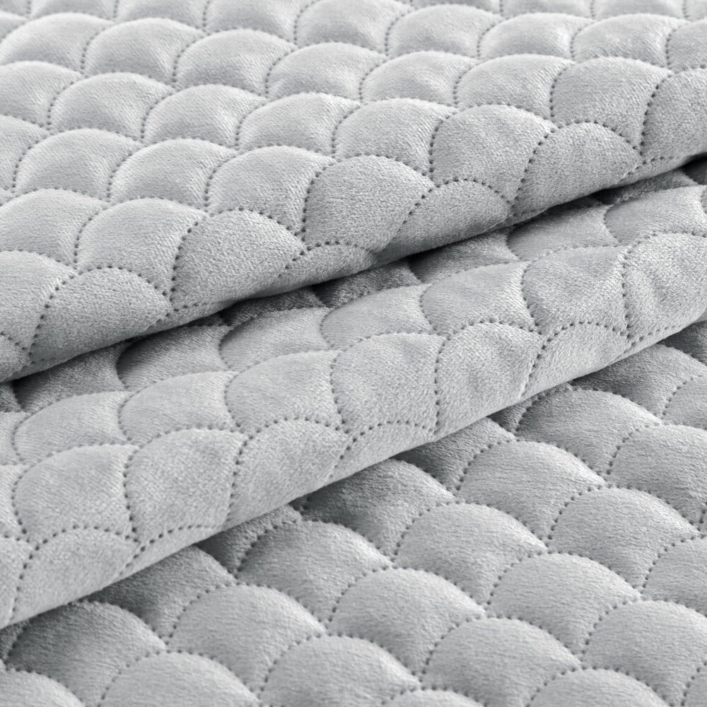Klasyczna i bardzo elegancka narzuta na łóżko z miękkiego welwetu pikowana w modny motyw łuski. Pikowania wykonane metodą bezszwową hotpress. szerokość: 220 cm, długość: 240 cm, kolor: srebrny, Gramatura: 180+70+100 GSM, Skład: 100% poliester