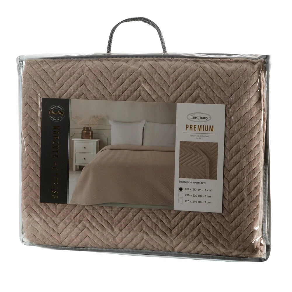 Narzuta hot press imitująca len szerokość: 170 cm, długość: 210 cm, kolor: ciemnobeżowy, Gramatura: 185 GSM, Skład: 100% poliester