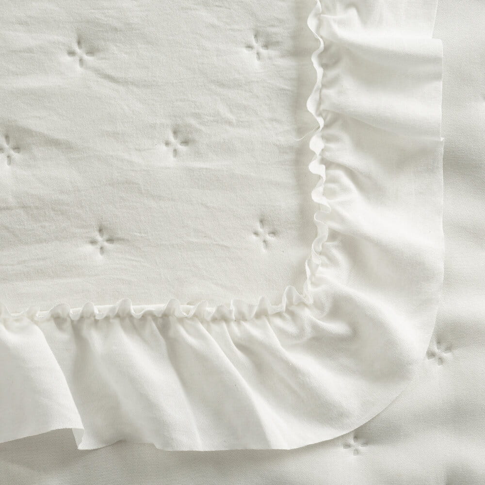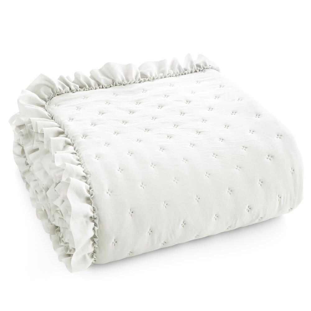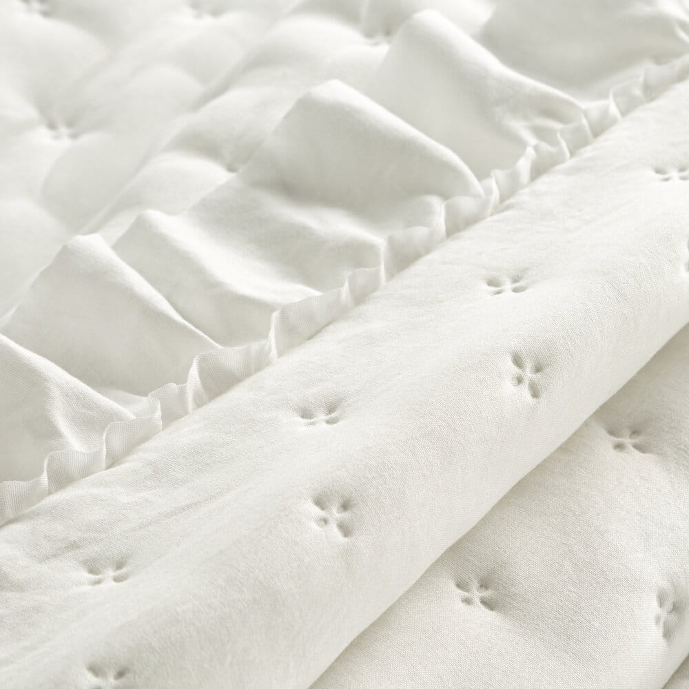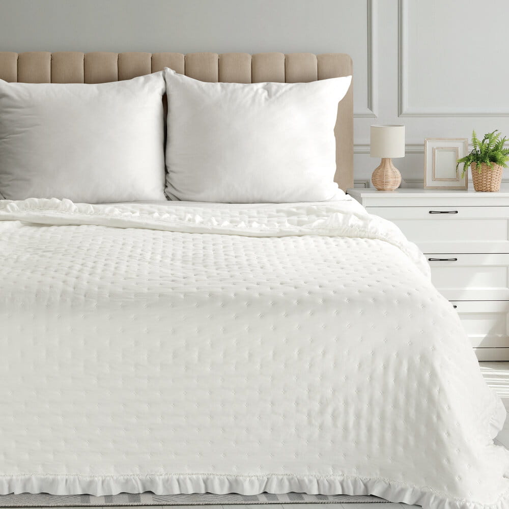 Narzuta jednokolorowa wykonana techniką hot press, obszyta falbaną szerokość: 220 cm, długość: 240 cm, kolor: kremowy, Gramatura: 80 GSM, Skład: 100% poliester
