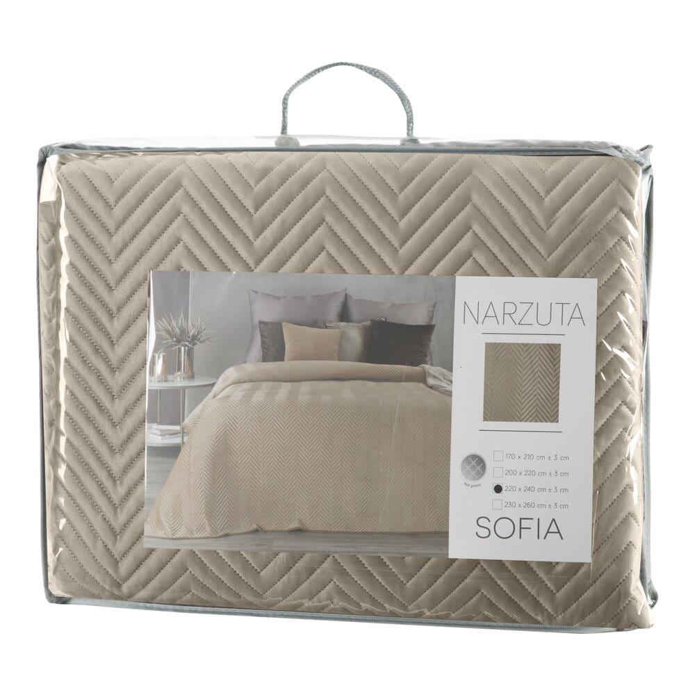 Ekskluzywna narzuta na łóżko z miękkiego i przyjemnego w dotyku welwetu pikowanego w dużą, gęstą jodełką. Do pikowania wykorzystano metodę bezszwową hotpress. szerokość: 220 cm, długość: 240 cm, kolor: beżowy, Gramatura: 250+120+65 GSM, Skład: 100% poliester