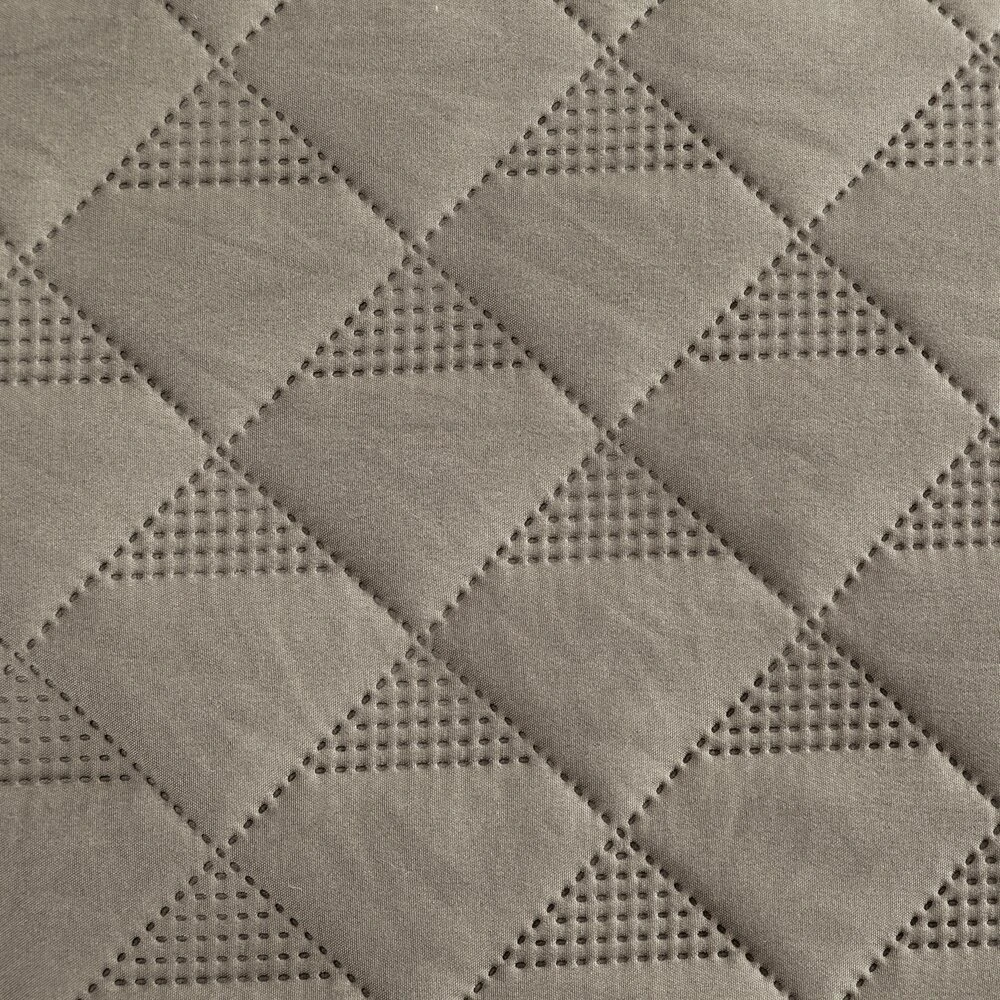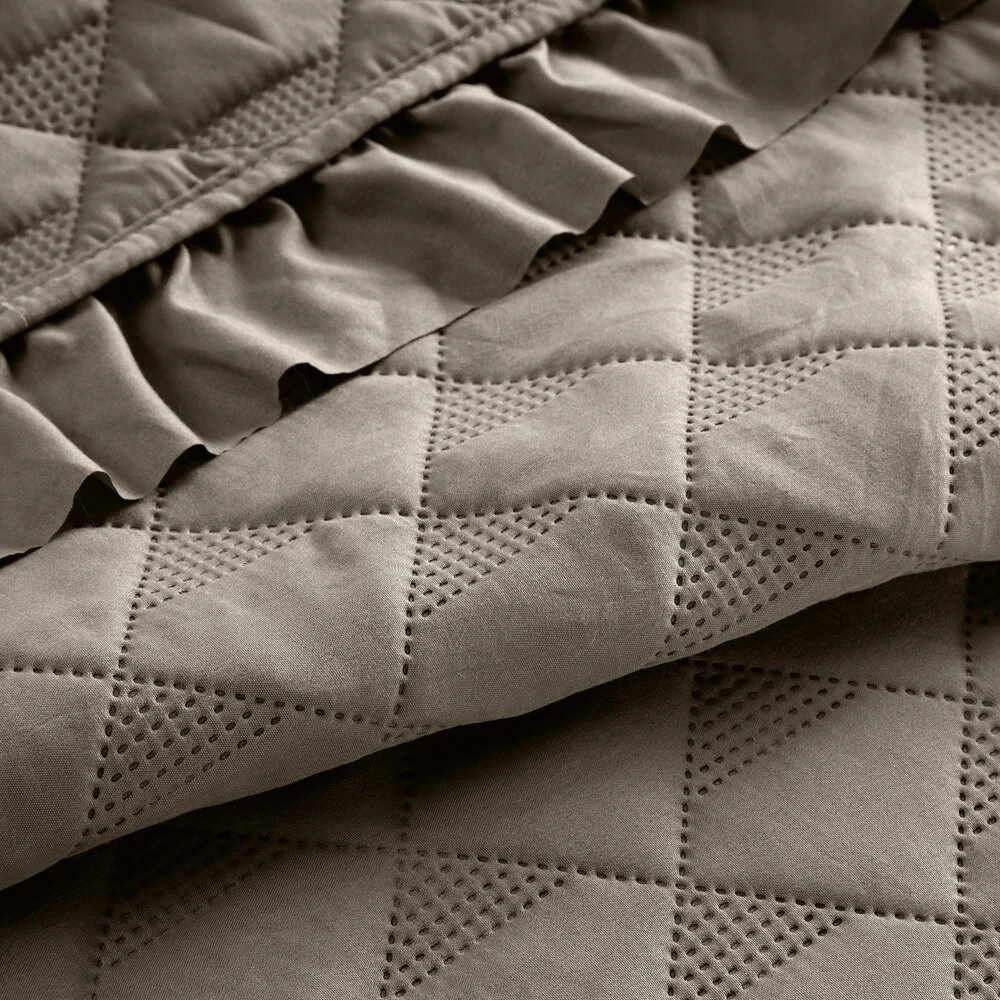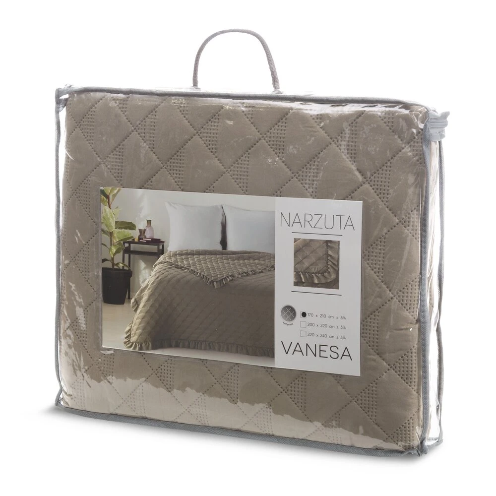 Narzuta jednokolorowa wykonana techniką hot press z falbaną szerokość: 170 cm, długość: 210 cm, kolor: ciemnobeżowy, Gramatura: 80 GSM, Skład: 100% poliester