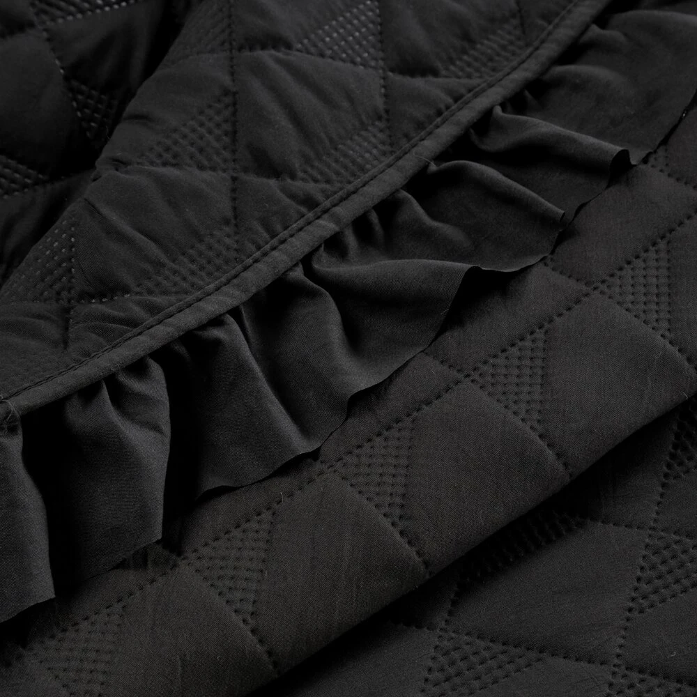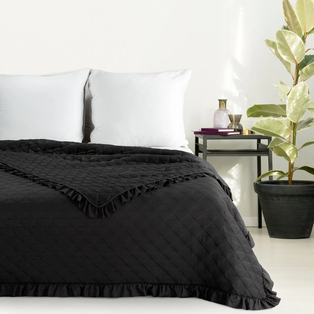 Narzuta jednokolorowa wykonana techniką hot press z falbaną szerokość: 220 cm, długość: 240 cm, kolor: czarny, Gramatura: 80 GSM, Skład: 100% poliester