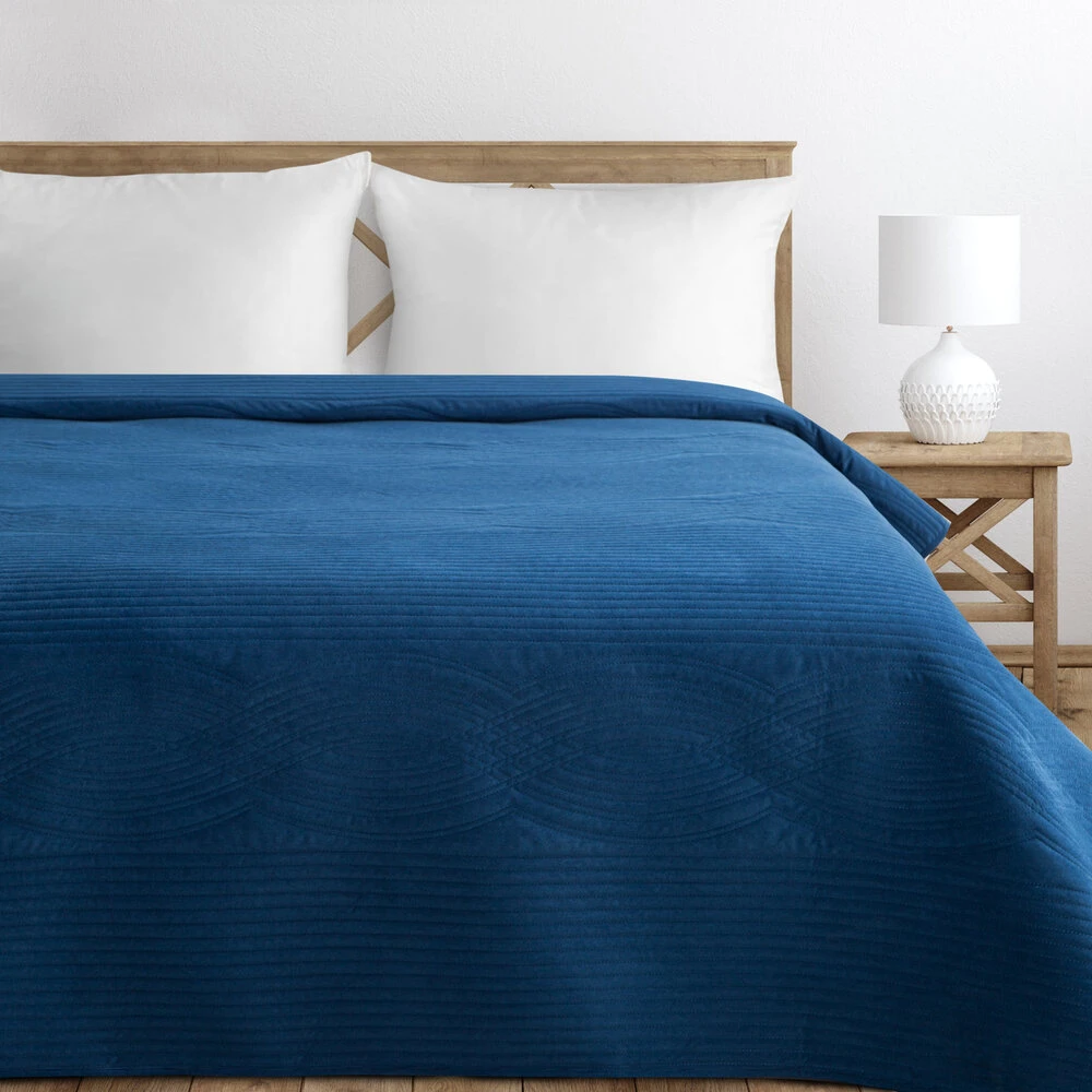 Narzuta welwetowa ozdobiona geometrycznym wzorem szerokość: 170 cm, długość: 210 cm, kolor: granatowy, Gramatura: 200 GSM, Skład: 100% poliester