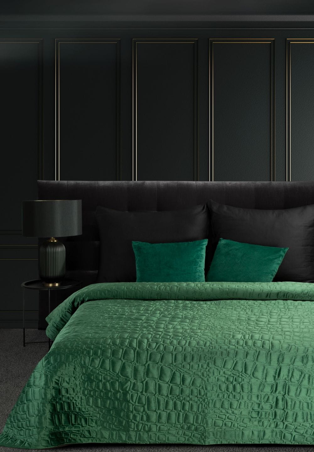 Narzuta welwetowa,wykonana techniką hot press" szerokość: 220 cm, długość: 240 cm, kolor: ciemnozielony, Gramatura: 200+120+70 GSM, Skład: 100%poliester"