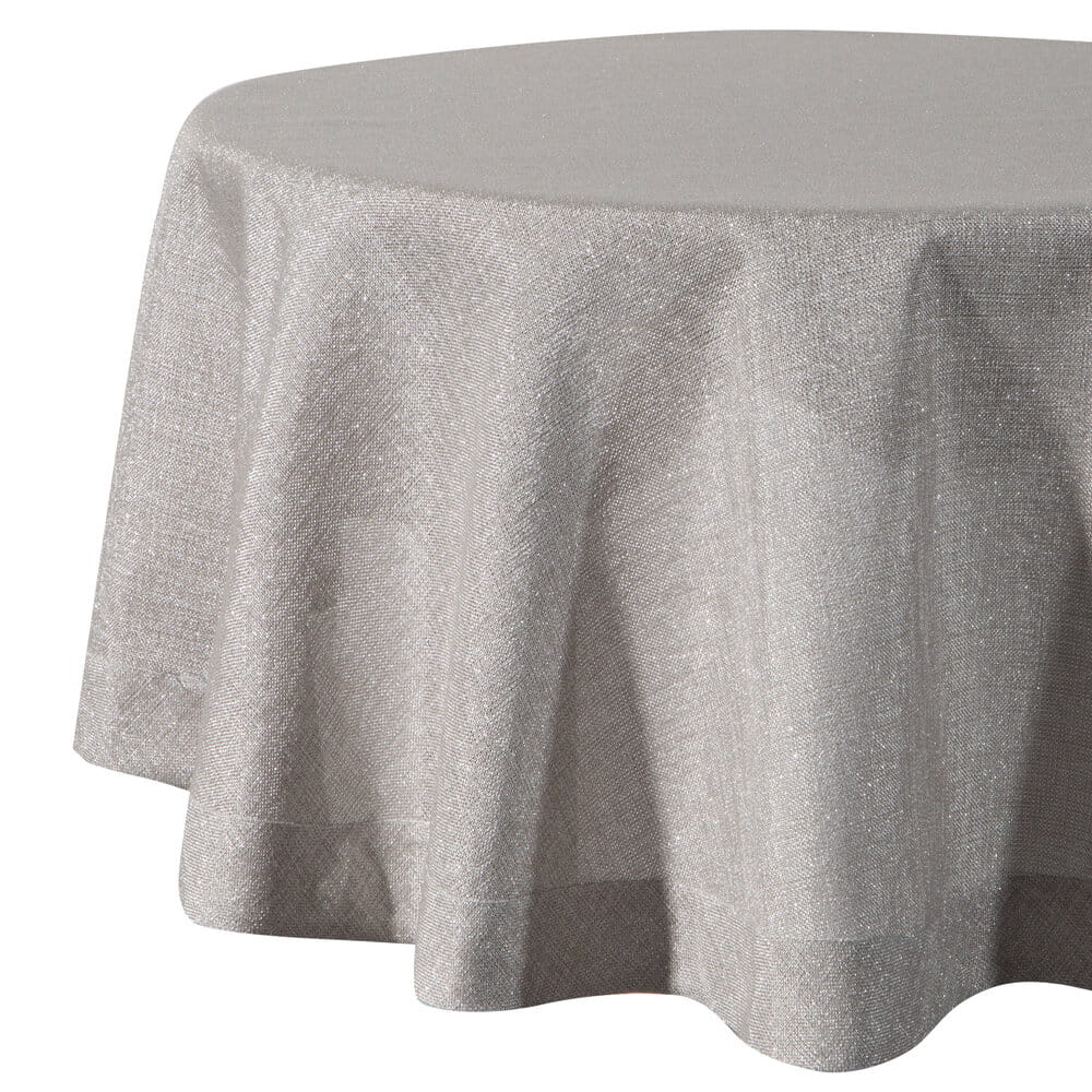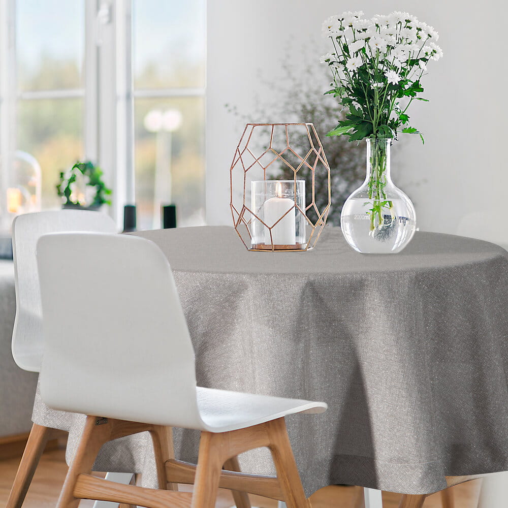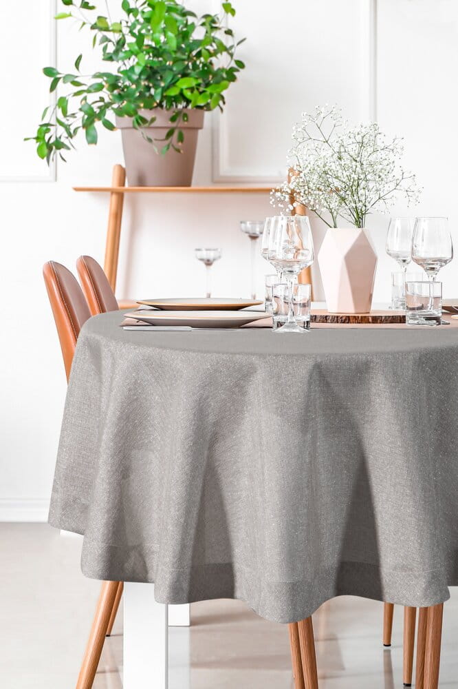 Obrus zdobiony kantą i srebrną nicią kolor: jasnoszary, Gramatura: 280 GSM, Skład: 100% poliester