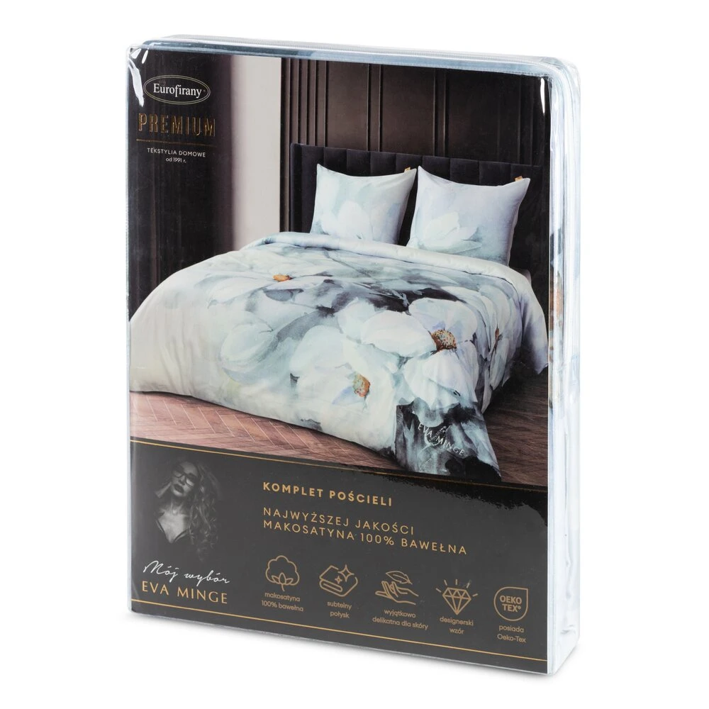 Komplet ekskluzywnej, designerskiej pościeli z satyny bawełnianej z kolekcji polecanej przez Eva Minge. Zapinana na zamek błyskawiczny. Precyzyjne wykonanie. szerokość: 160 cm, długość: 200 cm, kolor: miętowy, Gramatura: 125 GSM, Skład: makosatyna, 100% bawełna