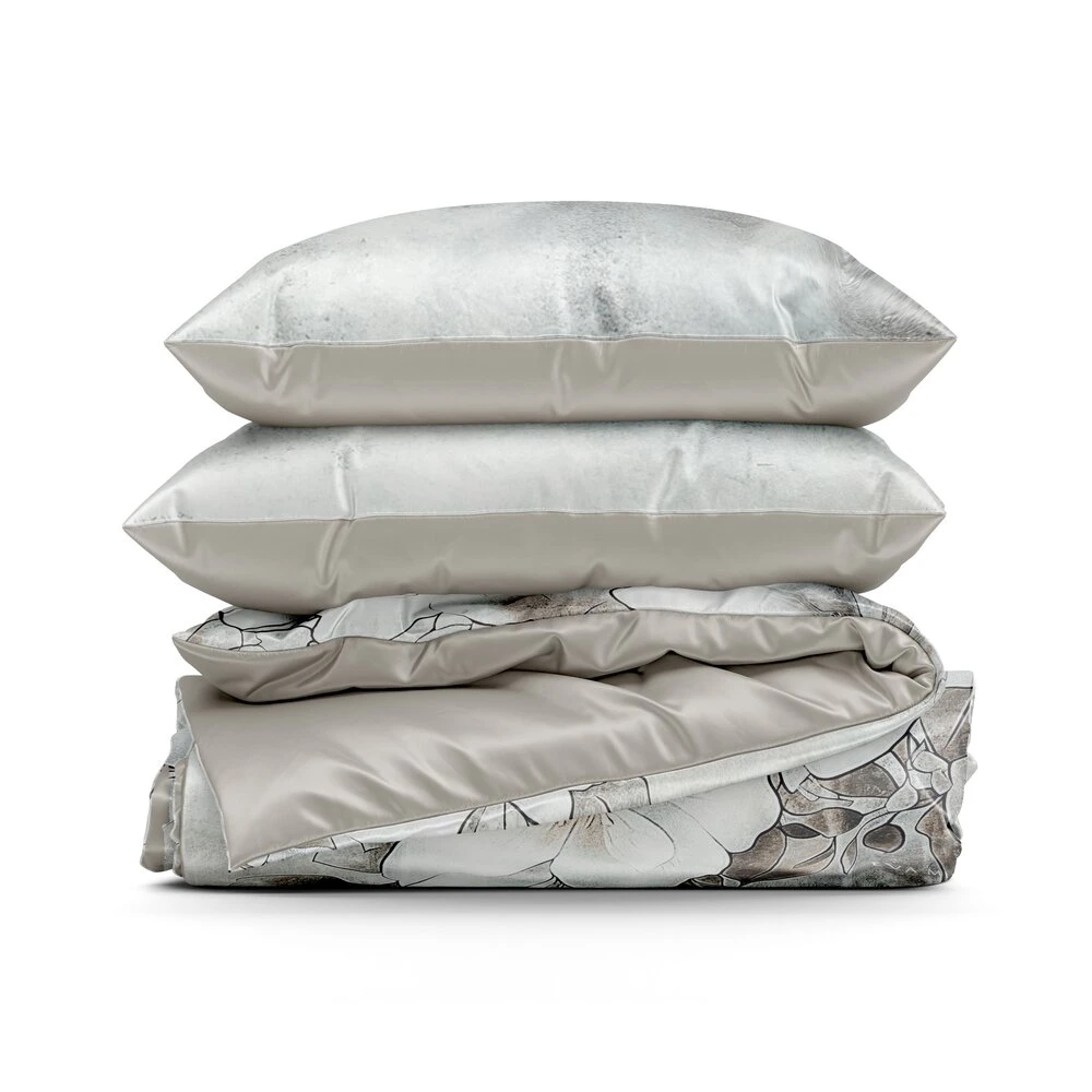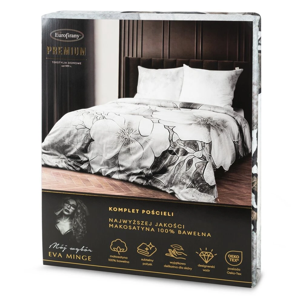 Komplet ekskluzywnej, designerskiej pościeli z satyny bawełnianej z kolekcji polecanej przez Eva Minge. Zapinana na zamek błyskawiczny. Precyzyjne wykonanie. szerokość: 160 cm, długość: 200 cm, kolor: szarobeżowy, Gramatura: 125 GSM, Skład: makosatyna, 100% bawełna