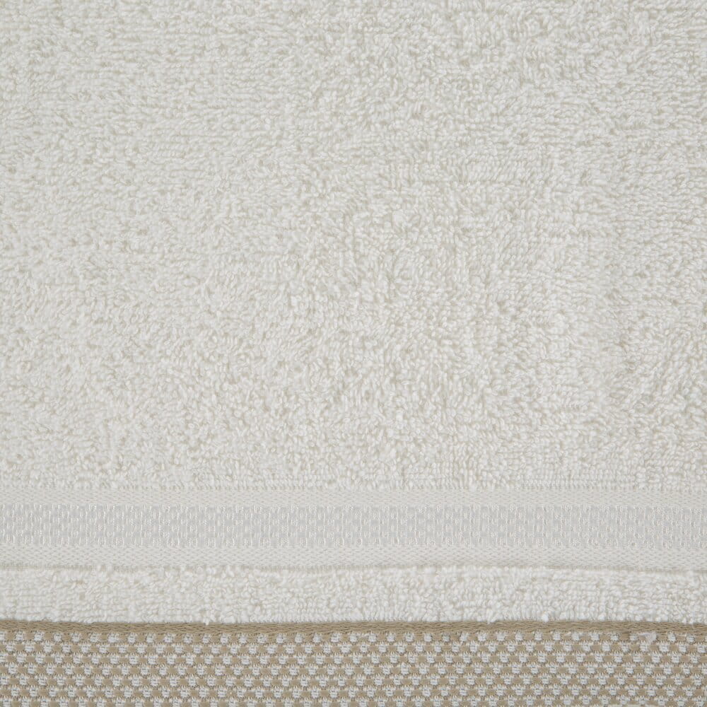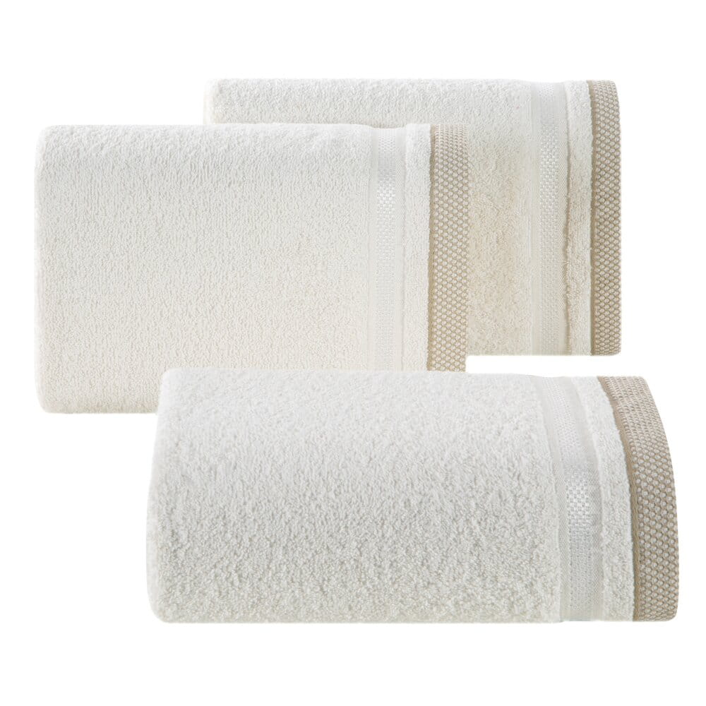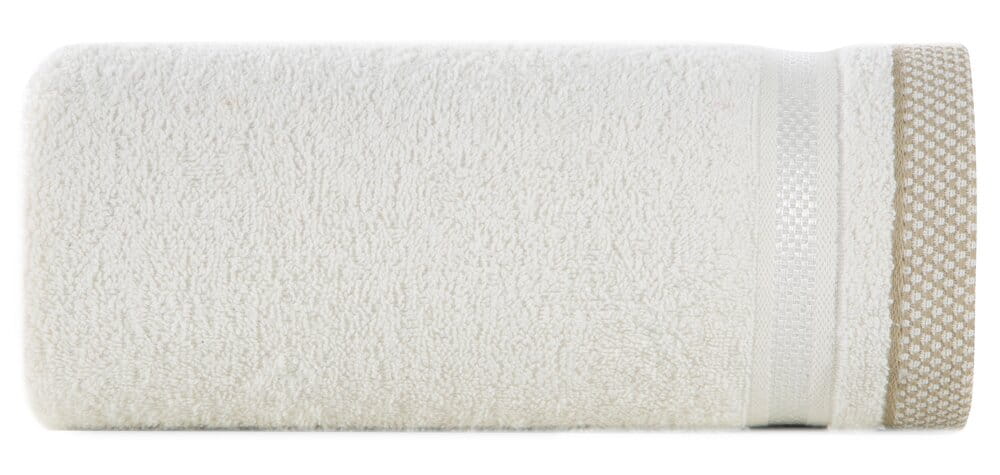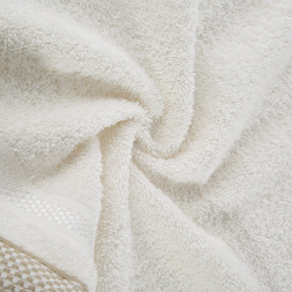 Jednobarwny ręcznik z miękkiej i chłonnej tkaniny bawełnianej o splocie frotte zdobiony kolorową bordiurą w stylu fastrygi. Łatwy w praniu, nie farbuje. szerokość: 70 cm, długość: 140 cm, kolor: kremowy, Gramatura: 500 GSM, Skład: 100% bawełna: część ozdobna: 75% poliester, 25% wiskoza