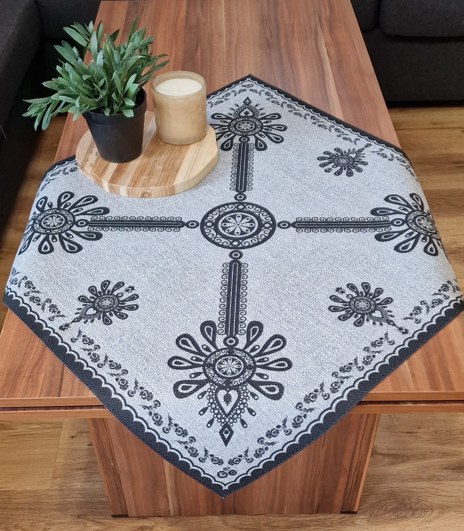 Serweta pełni funkcję dekoracyjną oraz praktyczną – chroni blat stołu, a jednocześnie porządkuje aranżację przestrzeni. Szary podkład jest elegancki i uniwersalny, natomiast kontrastowa czarna parzenica przyciąga wzrok i stanowi mocny akcent dekoracyjny. Całość prezentuje się estetycznie i schludnie nawet przy codziennym użytkowaniu.