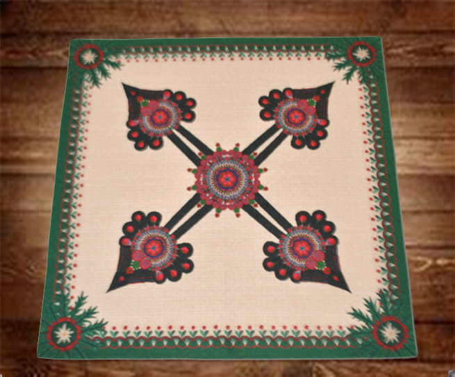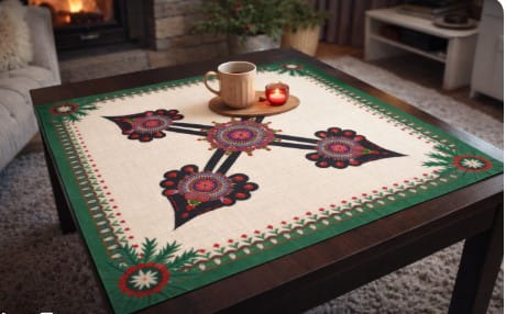 Serweta pełni funkcję ochronną i dekoracyjną. Chroni blat stołu, ławy lub komody przed zarysowaniami i zabrudzeniami, a jednocześnie stanowi wyrazisty element aranżacji. Jasne tło optycznie rozjaśnia przestrzeń, a kontrastowy wzór góralski przyciąga uwagę i buduje klimat wnętrza.