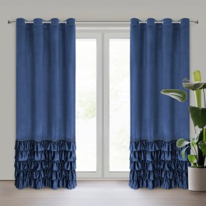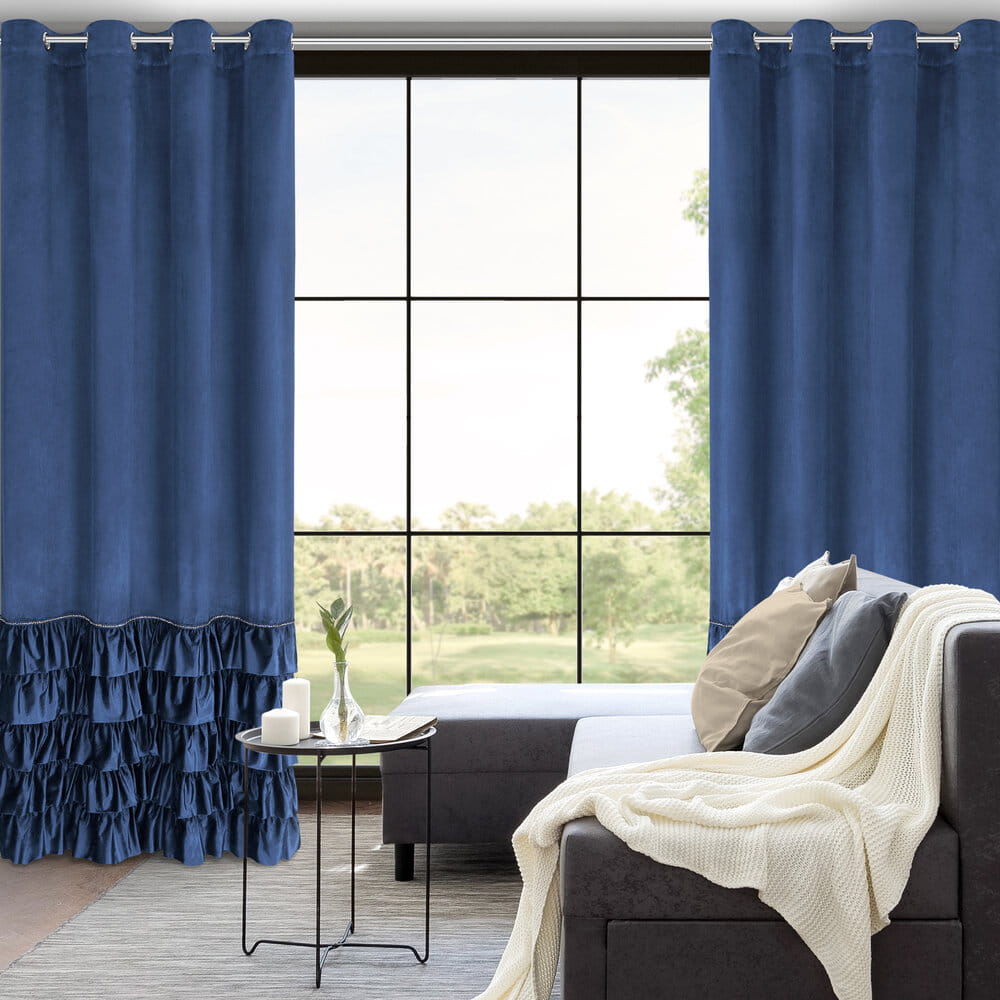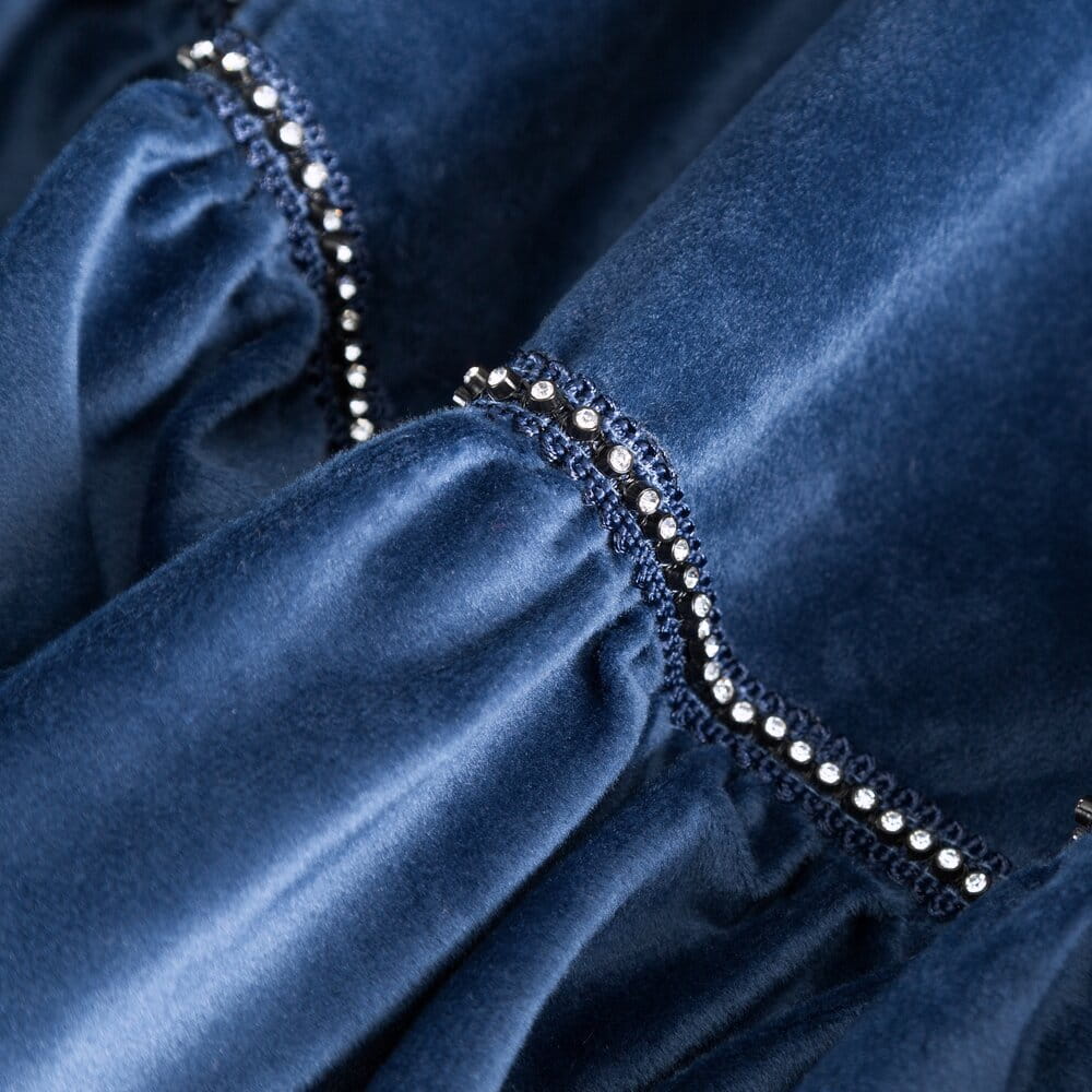 Zasłona gotowa welwetowa z falbanami i ozdobnymi cyrkoniami szerokość: 140 cm, długość: 250 cm, kolor: granatowy, Gramatura: 200 GSM, Skład: 100% poliester