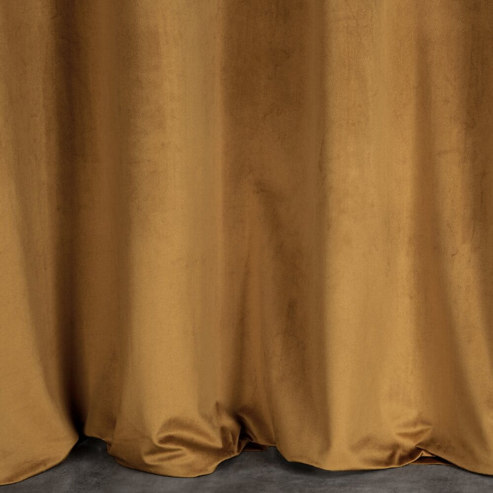 Miękka zasłona z welwetu o matowym wykończeniu. Mięsista tkanina o średnich właściwościach zaciemniających nadaje wnętrzu eleganckiego charakteru. szerokość: 140 cm, długość: 250 cm, kolor: miodowy, Gramatura: 200 GSM, Skład: 100% poliester