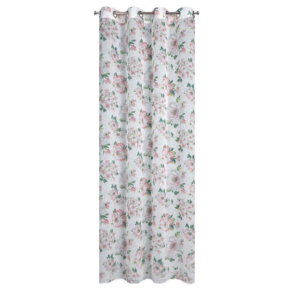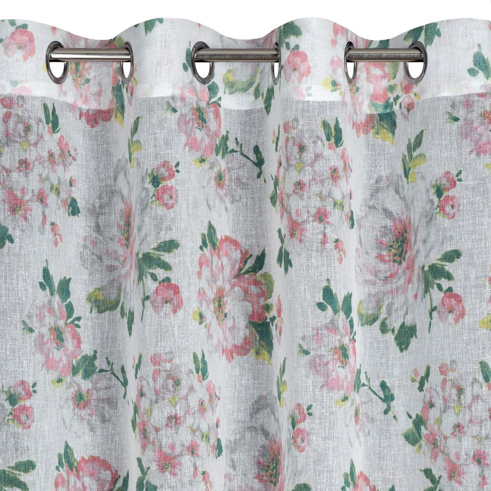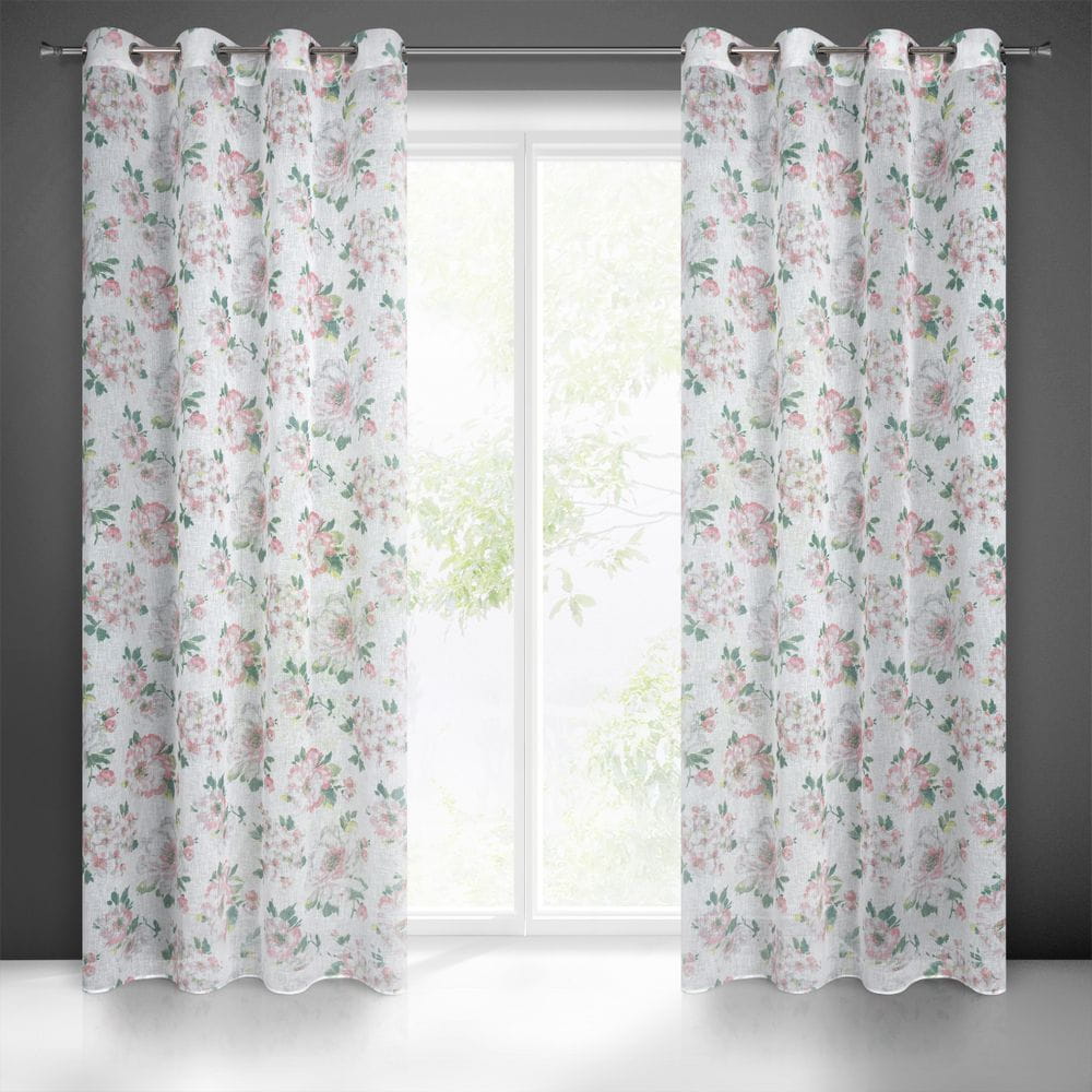 Klasyczna zasłona z tkaniny o strukturze płótna zdobiona pastelowym nadrukiem kwiatów ogrodowych. Średni stopień zaciemnienia. Tkanina łatwa w prasowaniu. szerokość: 140 cm, długość: 250 cm, kolor: biały/różowy, Gramatura: 110 GSM, Skład: 100% poliester