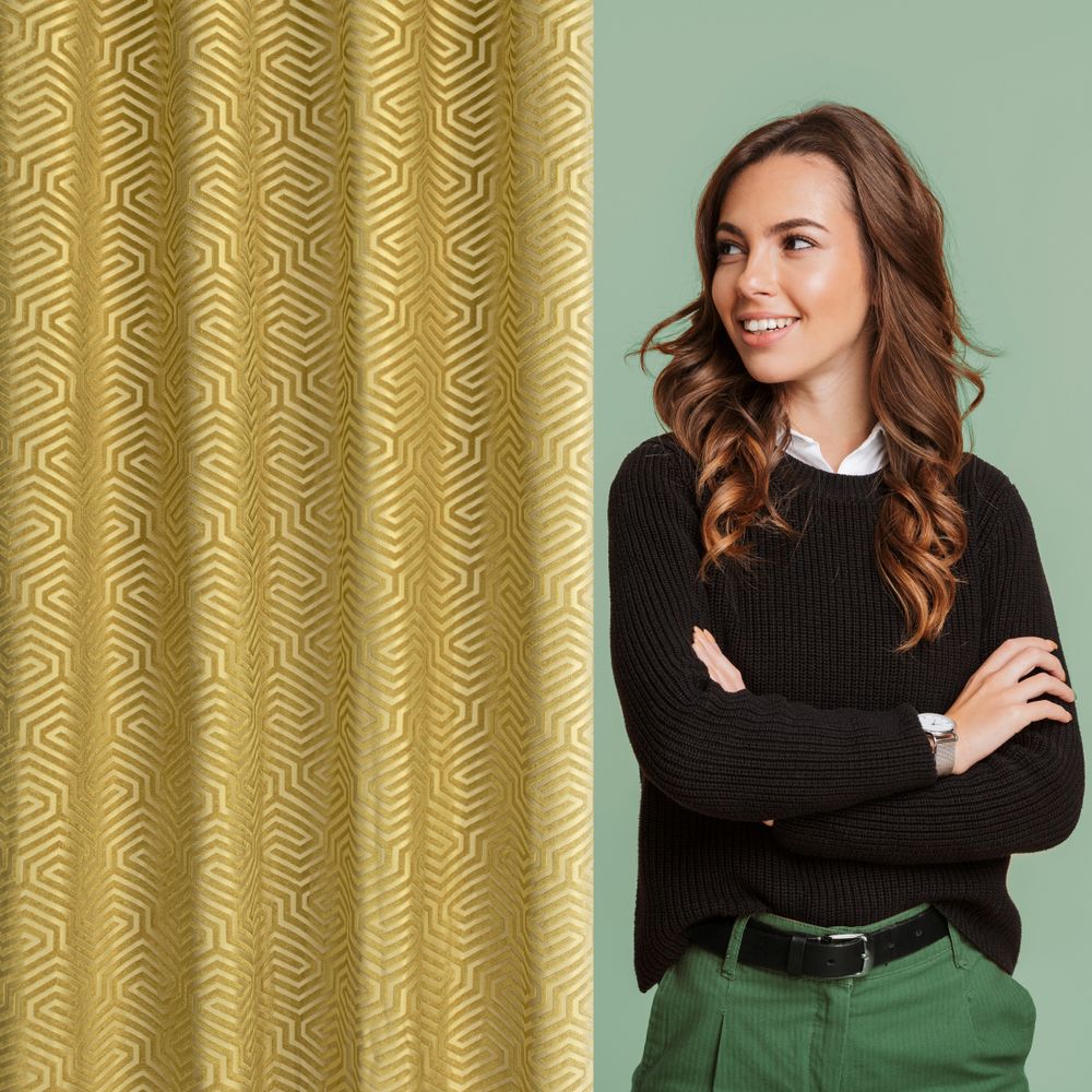 Zasłona z welwetu żakardowego z motywem geometrycznym szerokość: 140 cm, długość: 250 cm, kolor: miodowy, Gramatura: 320 GSM, Skład: 100%poliester
