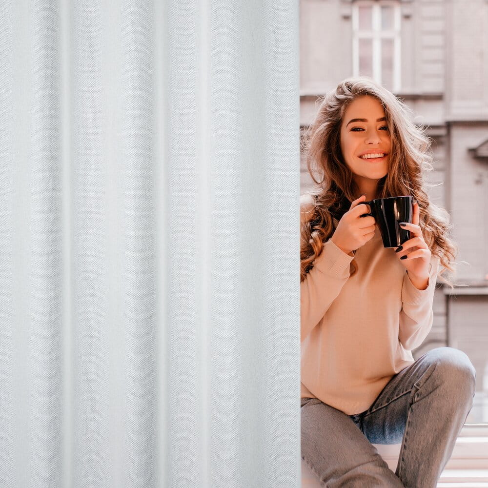 Firana o strukturze siatki zdobiona błyszczącą nicią na przelotkach