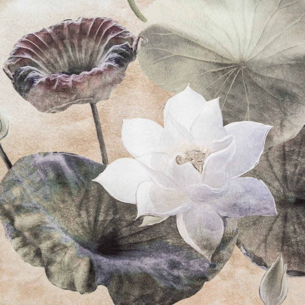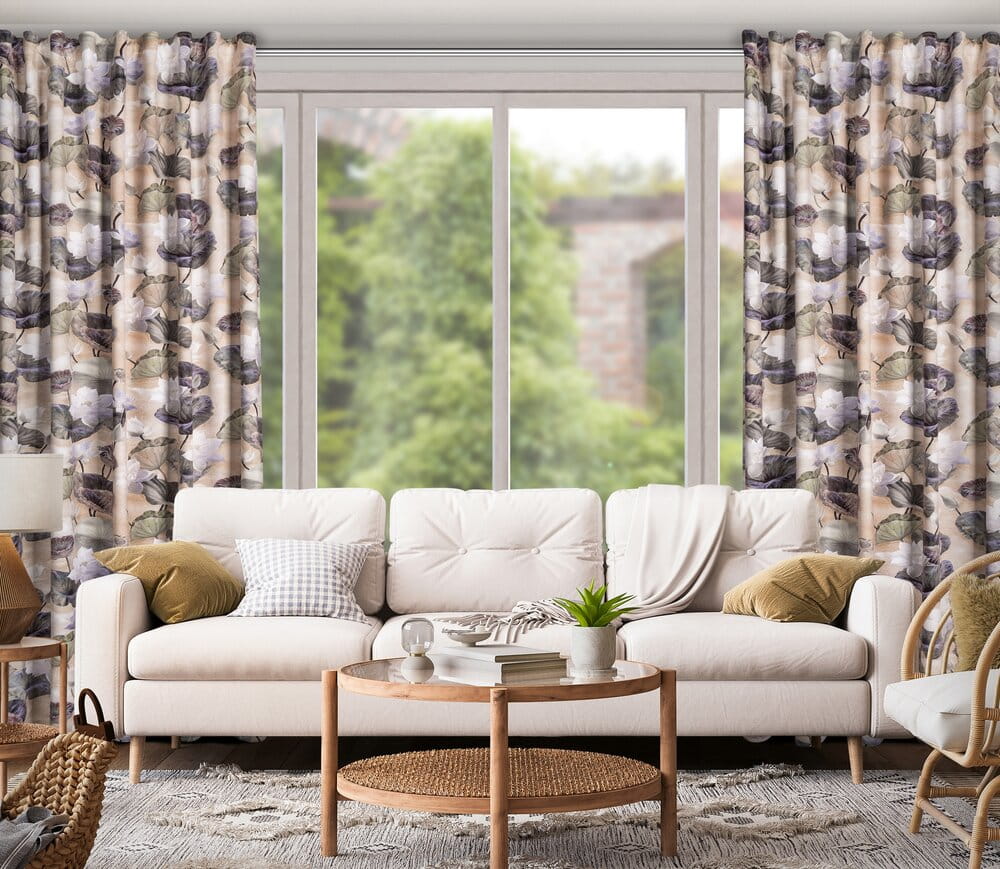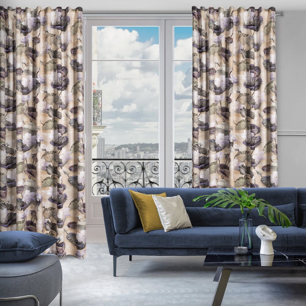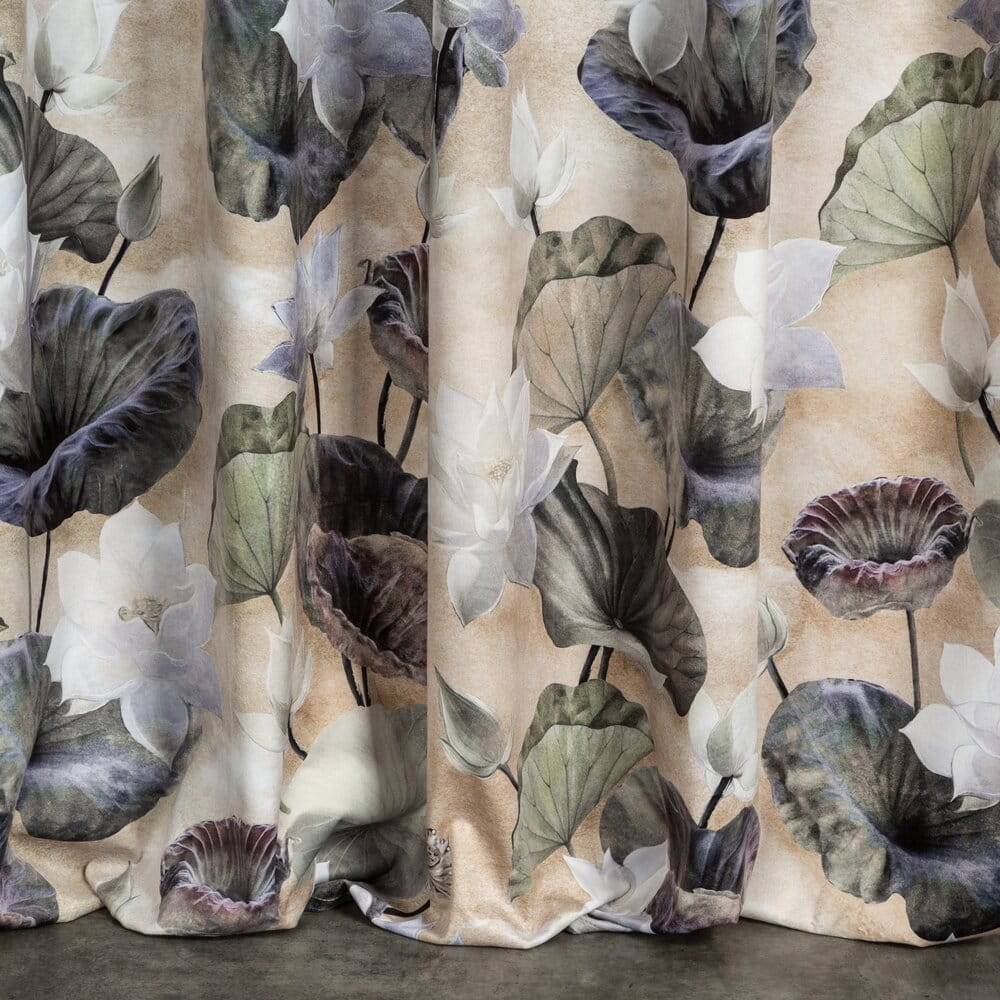 Zasłona welwetowa na taśmie z ukrytymi szelkami z nadrukiem kwiatowym szerokość: 140 cm, długość: 270 cm, kolor: beżowy, Gramatura: 200 GSM, Skład: 100% poliester