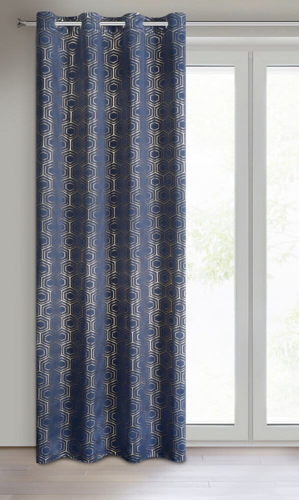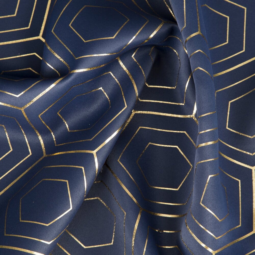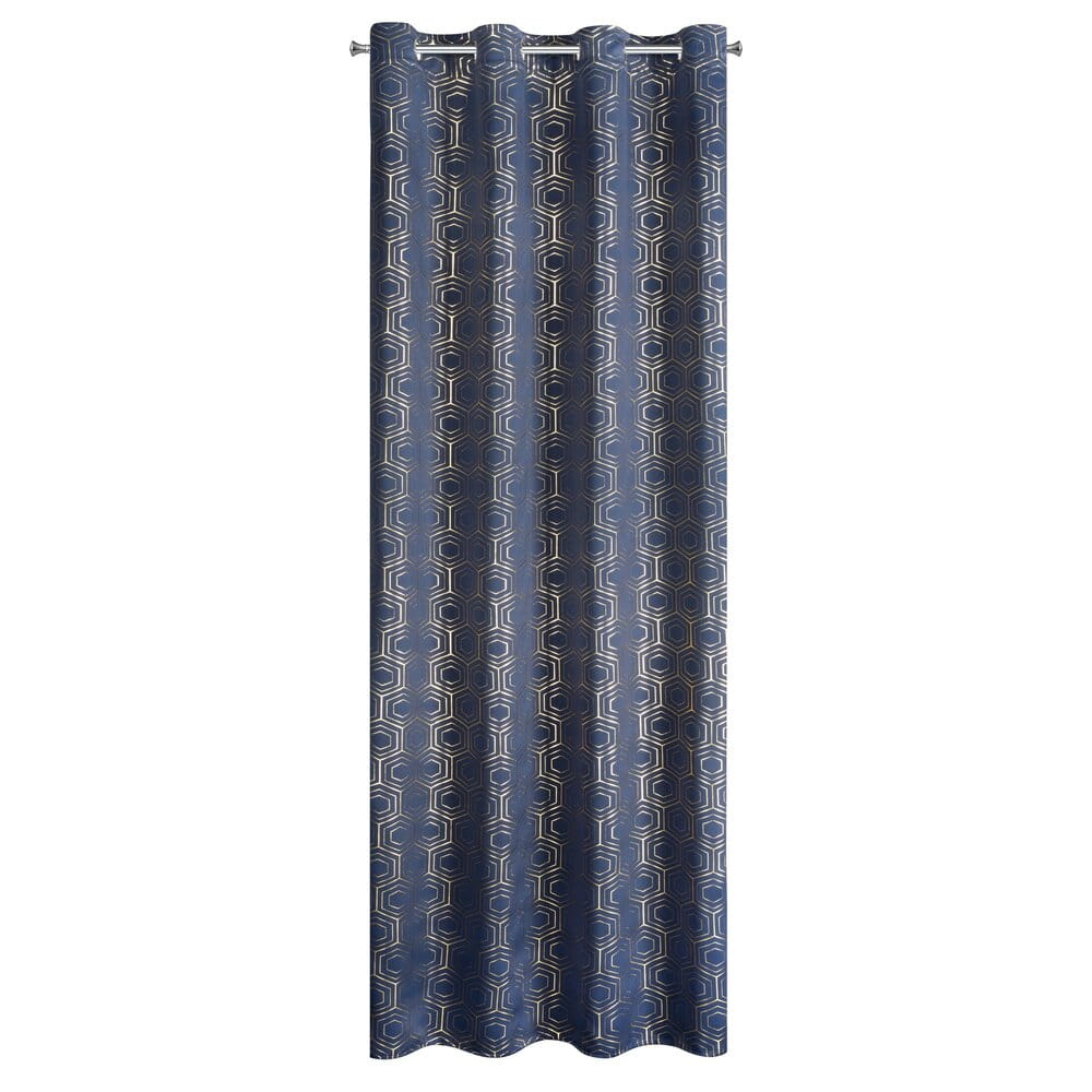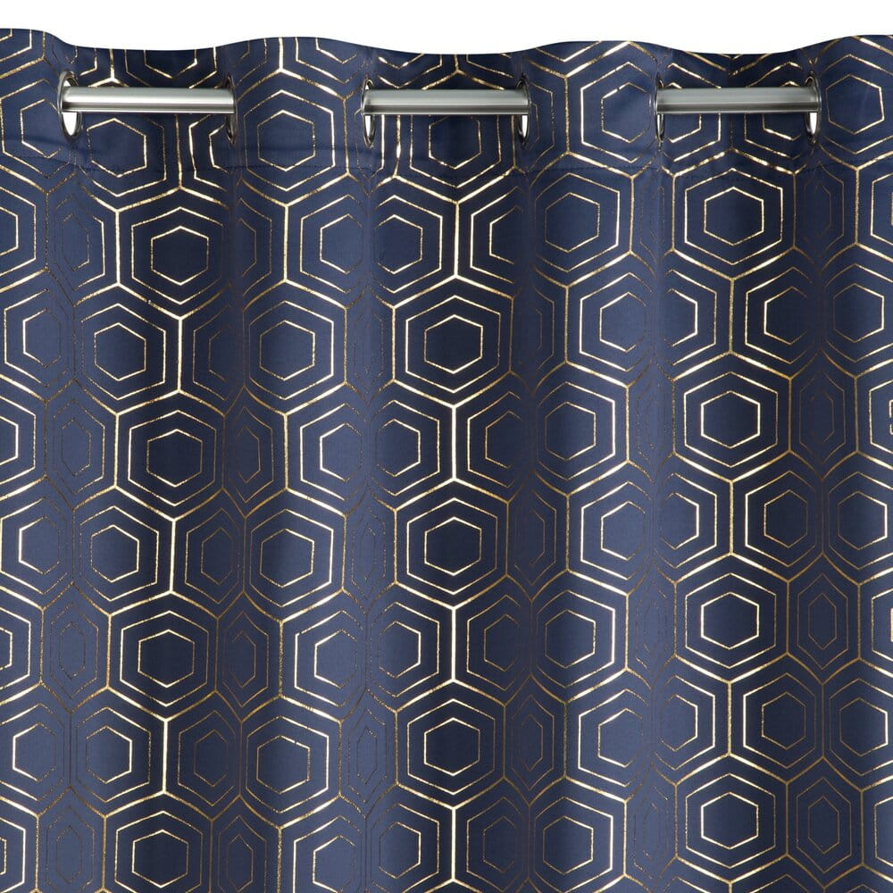 Zasłona zaciemniająca ze złotym, geometrycznym nadrukiem szerokość: 135 cm, długość: 250 cm, kolor: granatowy, Gramatura: 195 GSM, Skład: 100% poliester