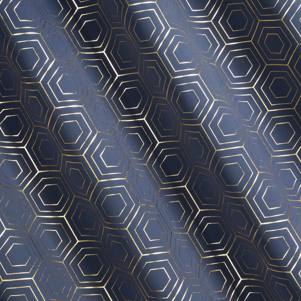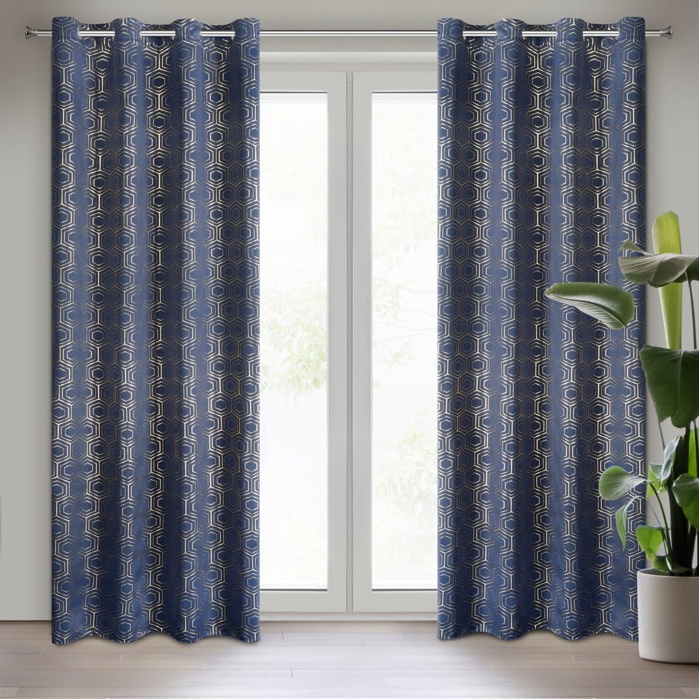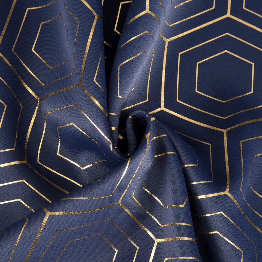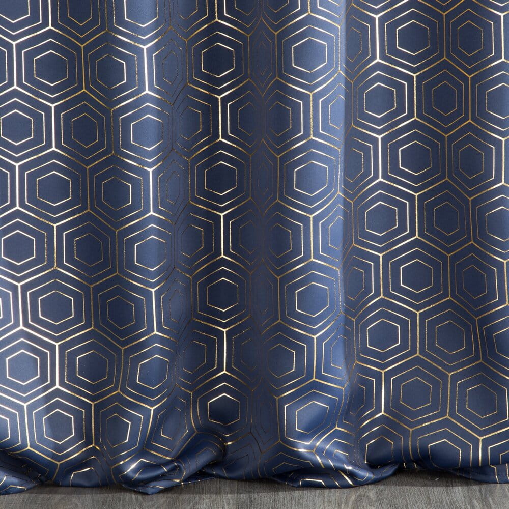 Zasłona zaciemniająca ze złotym, geometrycznym nadrukiem szerokość: 135 cm, długość: 250 cm, kolor: granatowy, Gramatura: 195 GSM, Skład: 100% poliester