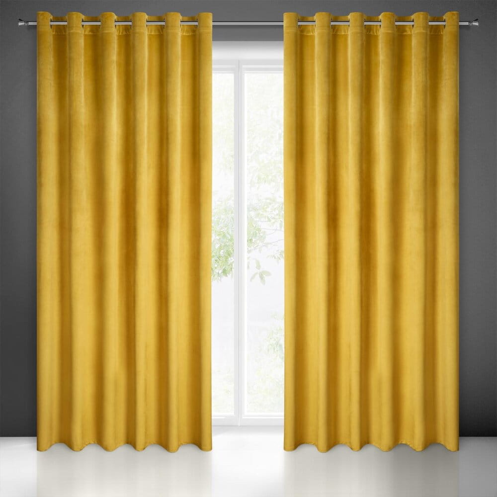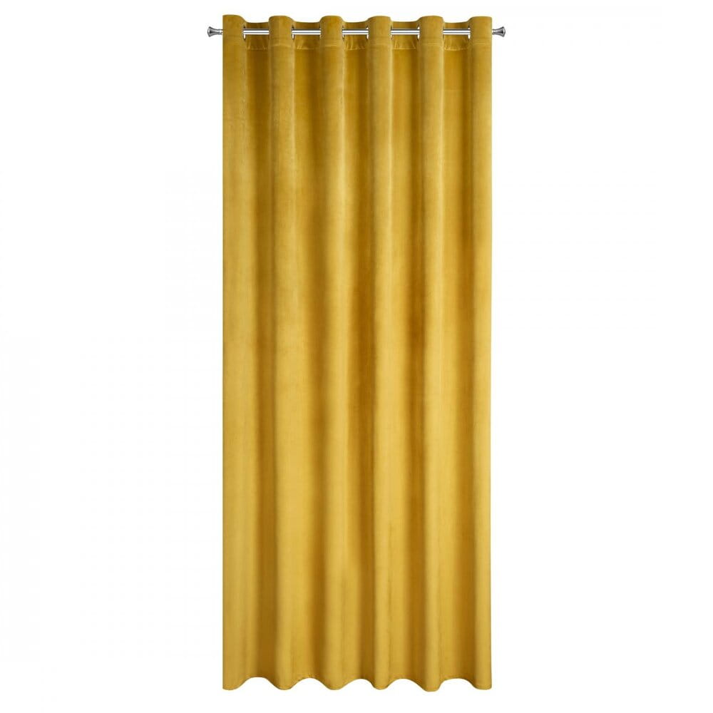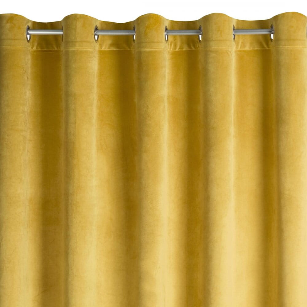 Miękka zasłona z welwetu o matowym wykończeniu. Mięsista tkanina o średnich właściwościach zaciemniających nadaje wnętrzu eleganckiego charakteru. szerokość: 215 cm, długość: 250 cm, kolor: musztardowy, Gramatura: 200 GSM, Skład: 100% poliester