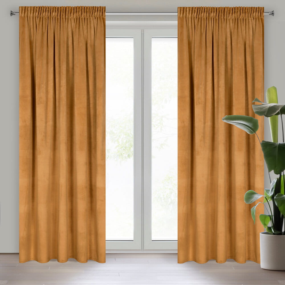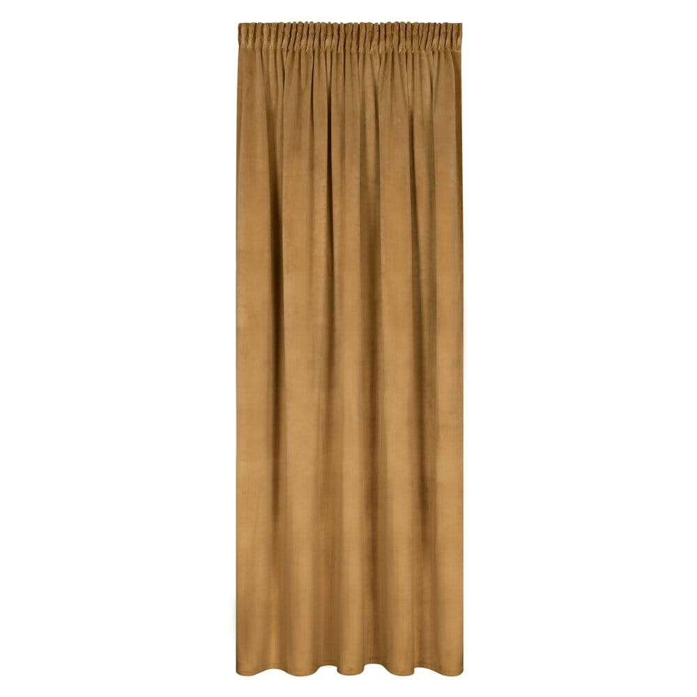 Miękka zasłona z welwetu o matowym wykończeniu. Mięsista tkanina o średnich właściwościach zaciemniających nadaje wnętrzu eleganckiego charakteru. szerokość: 140 cm, długość: 270 cm, kolor: miodowy, Gramatura: 200 GSM, Skład: 100% poliester